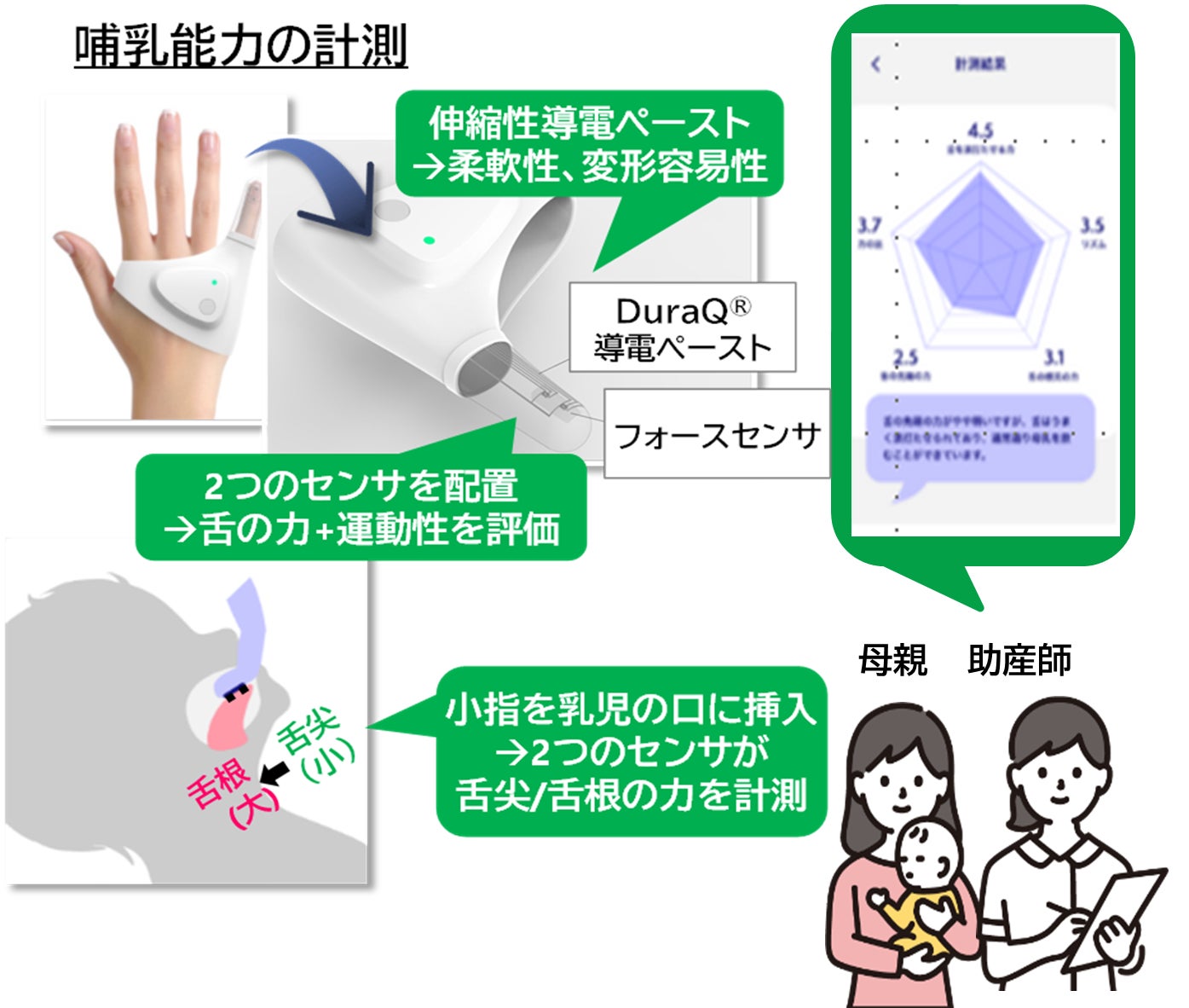 新開発のセンサデバイスで赤ちゃんの吸てつの状態を可視化