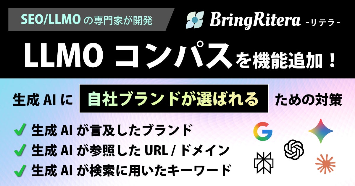 株式会社BringFlower(東京都新宿区、代表取締役:稲田 高洋)は、当社が開発・提供するSEO/LLMOの対策プラットフォーム「リテラ(BringRitera)」について、生成AIがユーザーの問いに対して参照したURLと、検索に用いた検索キーワードを可視化する機能「LLMOコンパス」を追加しました。「LLMOコンパス」には、生成AIがユーザーの問いに対して自社・競合のブランドをどの程度選んでいるかを、AIモデル別・期間別に把握できる機能もあり、AI時代の新しいマーケティング手法「LLMO(AI検索対策)」の羅針盤となります。