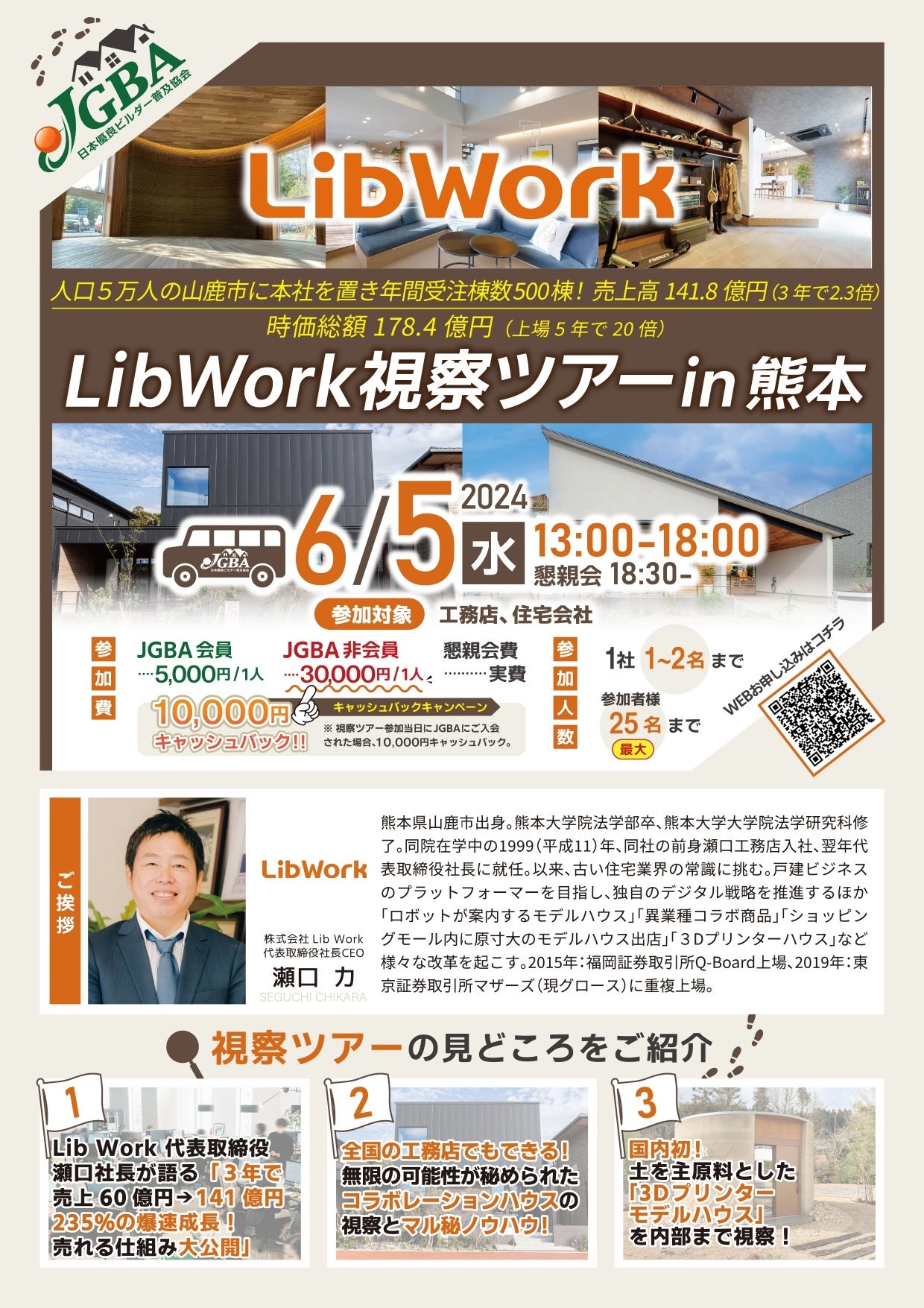 今年のJGBA初となる視察ツアー開催企業は人口5万人の熊本県山鹿市に本社を置き年間受注棟数500棟、売上高141.8億円(3年で2.3倍)時価総額178.4億円(上場5年で20倍)を誇る株式会社Lib Work(本社:熊本県山鹿市、代表取締役社長CEO:瀬口力)で決定しており、同社の事務所や店舗、展示場といった施設を実際に視察する予定となっております。2024年6月5日(水)に開催が決定しており、会員企業に問わず全国の工務店、住宅会社が参加予定です。