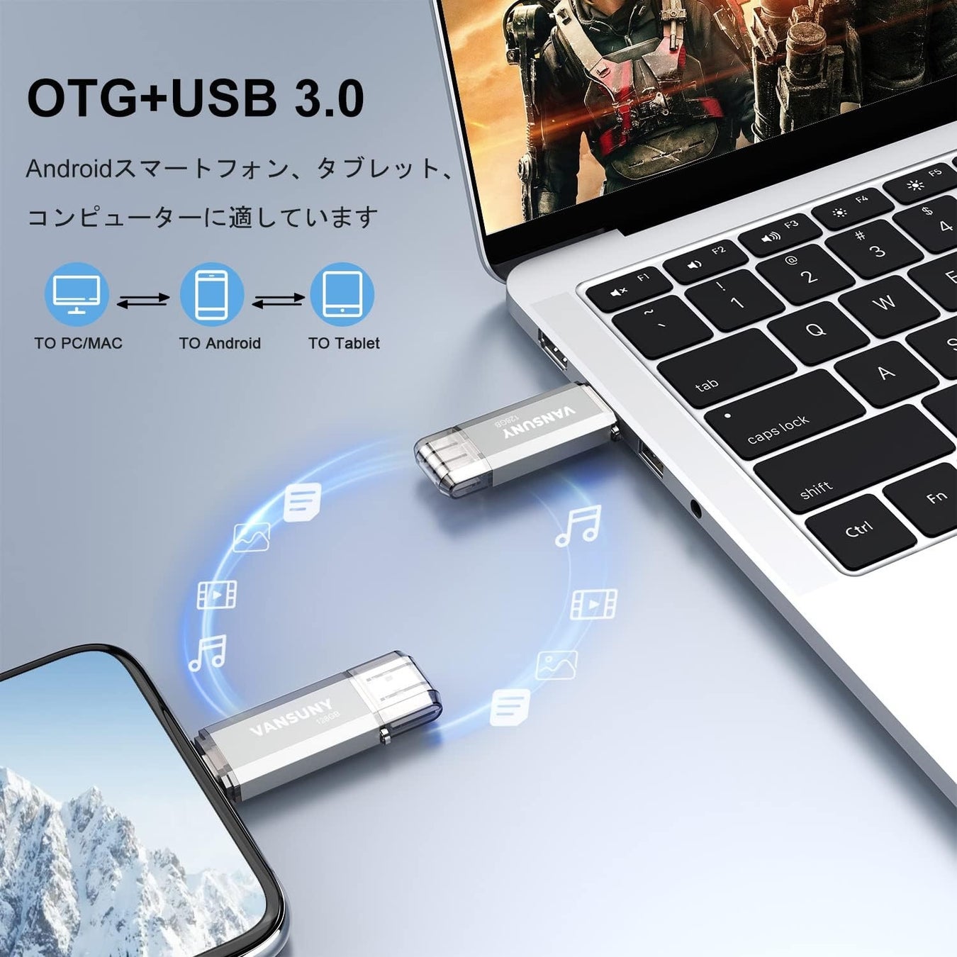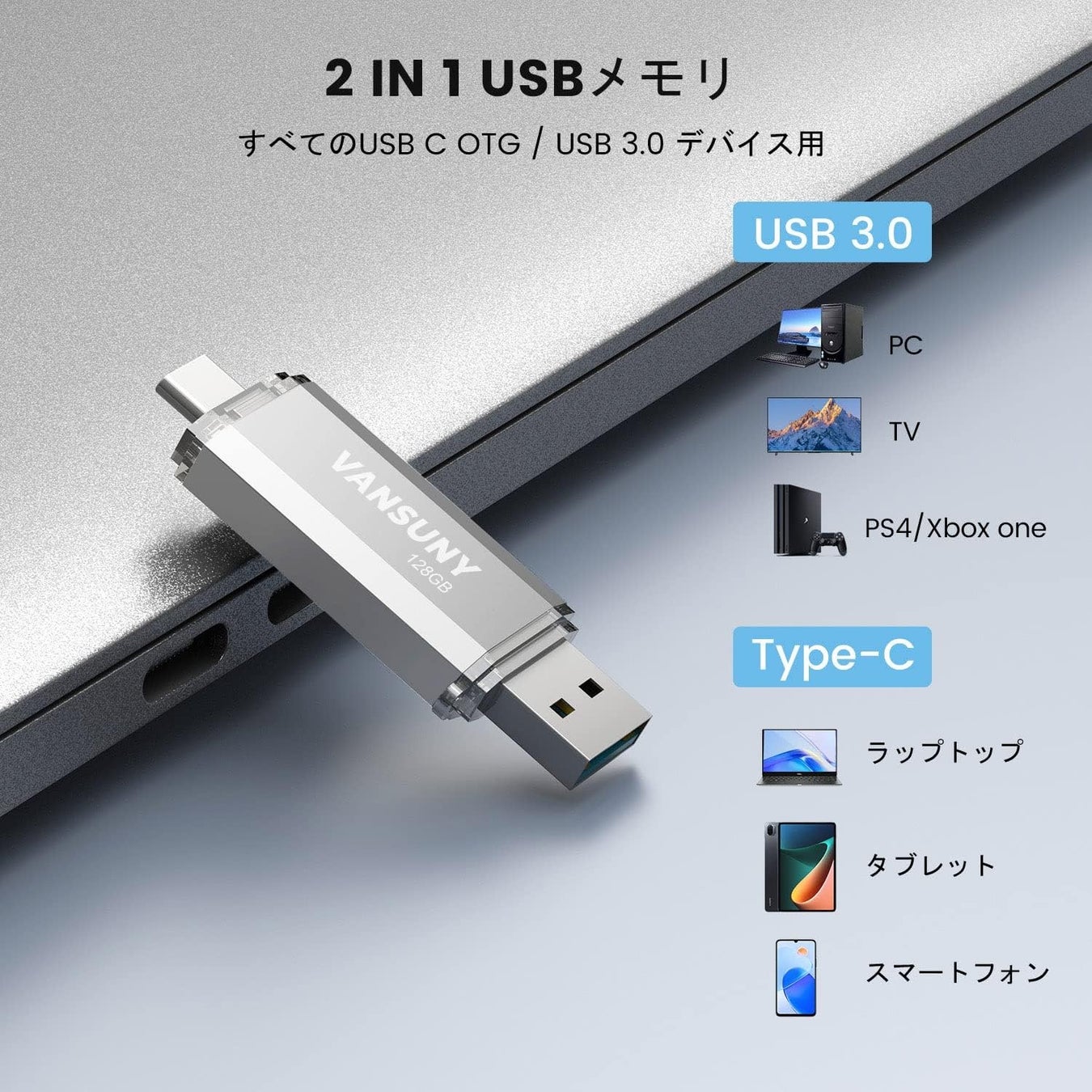 VANSUNY USBメモリ Type-C 128GB 高速転送データ USBフラッシュドライブ 2in1 OTG USB 3.0 + USB Cメモリスティック デュアル タイプC 128ギガ 大容量 (銀)