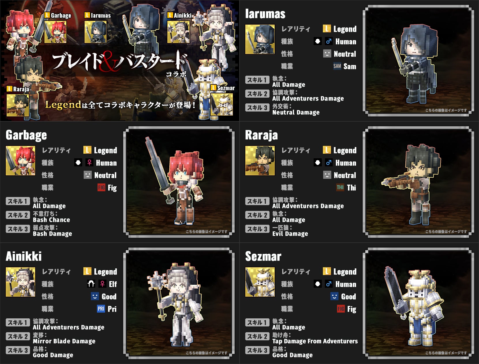 『ブレイド&バスタード』から主要キャラクターであるイアルマス、ガーベイジ、ララジャ、アイニッキ、セズマールの5体が最高レアリティのLegendで登場!