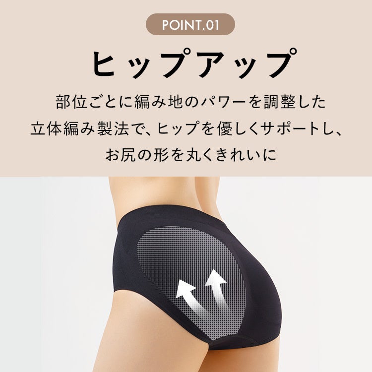 「BAMBI WATER スタイルナイトブラ」と同様の素材とカラーのため、セットアップで着用が可能。毎日快適に着用していただけるよう、フリルやタグなどの装飾をそぎ落とし、下着のラインがアウターに響きにくいフラットなデザインを採用しました。部位ごとに編み地のパワーを調整した立体編み製法で、ソフトな着圧でありながらストレスフリーな仕上がりになるよう細部までこだわりました。ヒップを優しくサポートし、お尻の形を丸く、美しく見せることができます。