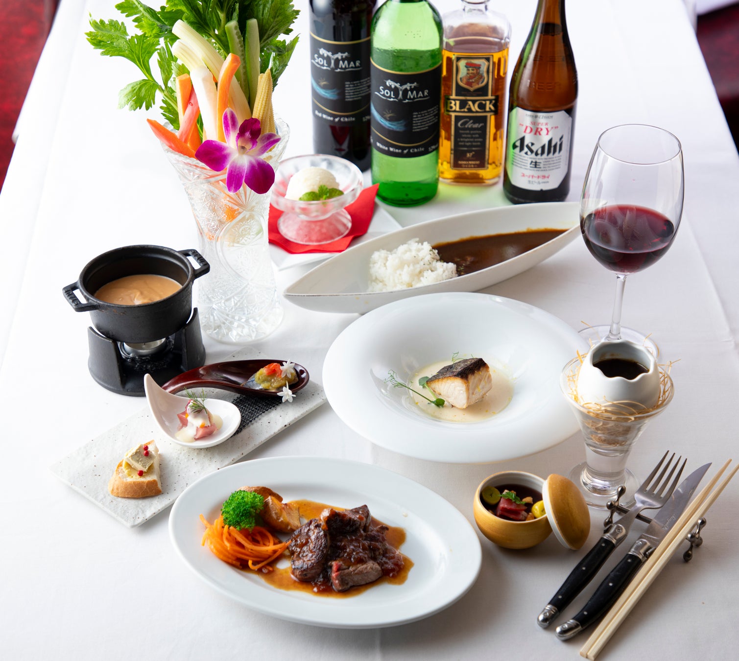 『銀座あしべ』では、旬の食材をふんだんに使った創作料理のフルコースをご提供。柳橋市場直送の鮮魚や、定番人気の『旬菜のスティックサラダ 和風バーニャカウダソース』、さらに熟成黒毛和牛のステーキなど、年末にふさわしい豪華なメニューを組んでいます。お酒は瓶ビールやワイン、ハイボール、カクテルなどお料理に合う16種類を用意。会食や大切な方との食事にも適しています。