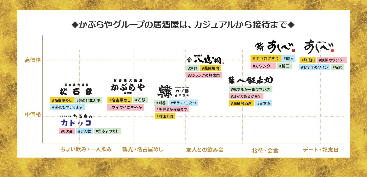 名古屋名物を中心とした居酒屋、海鮮料理、熟成肉ステーキ、韓国料理、焼肉など、多彩なラインナップを展開。多様な利用シーンに対応します。
