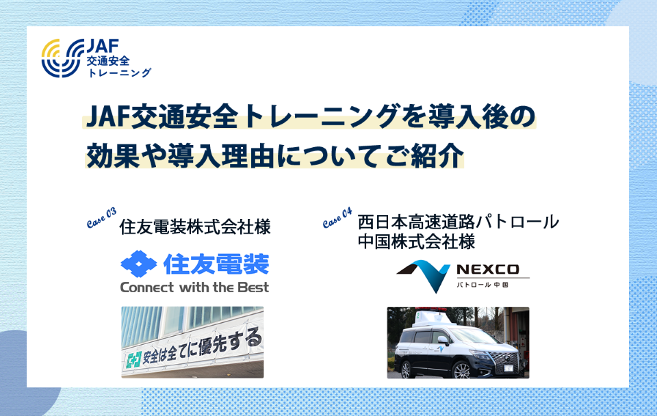 株式会社JAFメディアワークス(代表取締役社長:日野眞吾、所在地:東京都港区)が運営する「JAF交通安全トレーニング」(通称:JAFトレ)は、住友電装株式会社様と西日本高速道路パトロール中国株式会社様の導入企業事例インタビューを公開いたしました。