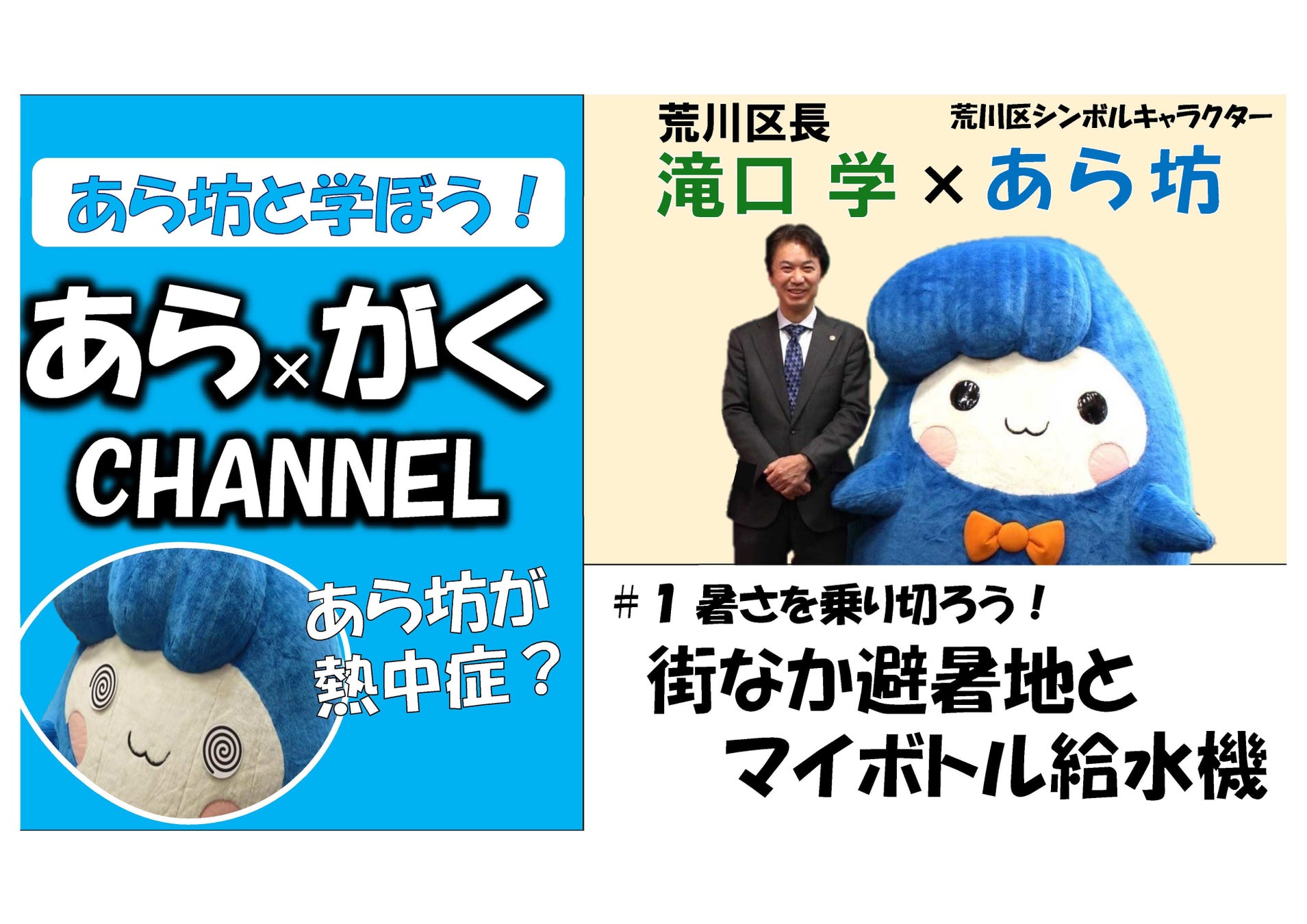 記念すべき第1回は、「暑さを乗り切ろう! 街なか避暑地とマイボトル給水機」。滝口区長とあら坊のユーモラスな掛け合いで、夏の熱中症の予防と対処法を呼びかけます。