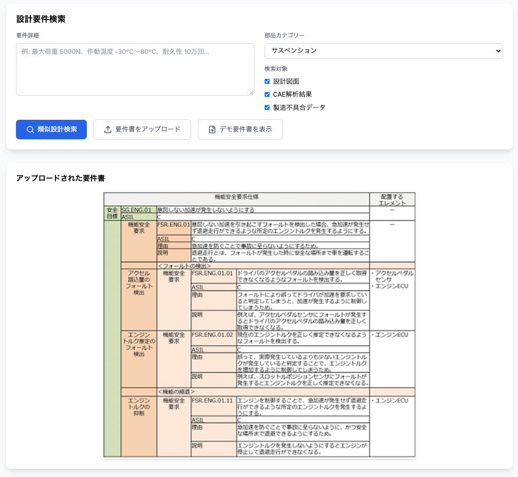入力された要件に基づき、過去の類似設計事例を自動検索。従来手作業で行っていた検索時間を大幅に短縮し、設計工数の削減を支援します。
