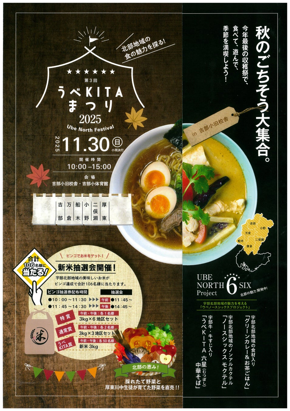 宇部市の北部地域(吉部・万倉・船木・小野・厚東・二俣瀬)は、新鮮で力強い「おいしい魅力」がいっぱい。今回のうべKITAまつりでは、新開発した「うべKITA六星(むつぼし)中華そば」が登場!