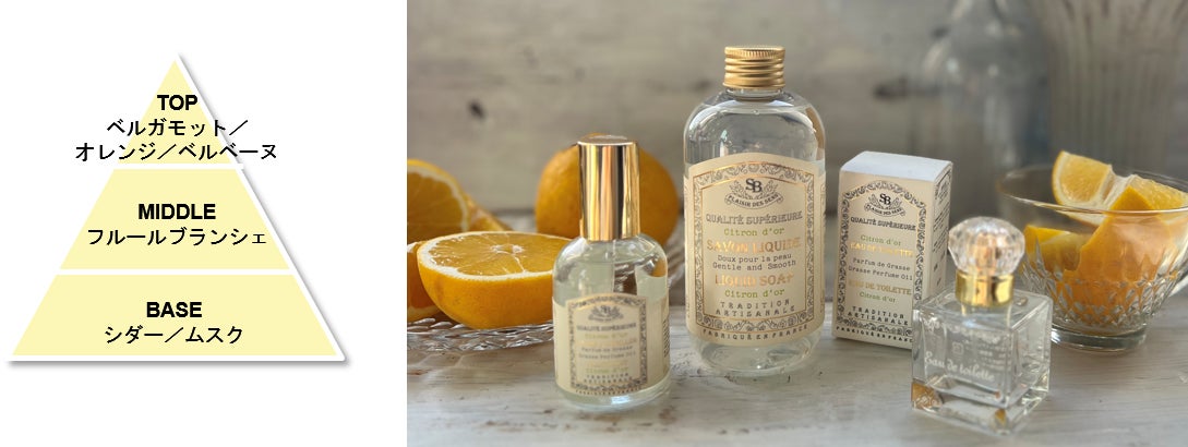 この地で陽光をたっぷり浴びて育つ果実をイメージした香り〈シトロンドール〉は、トップにベルガモット、オレンジ、ベルベーヌ、ミドルにフルールブランシェ、ベースにシダーとムスクをブレンドした、爽やかで奥行きのあるシトラスフレグランスです。