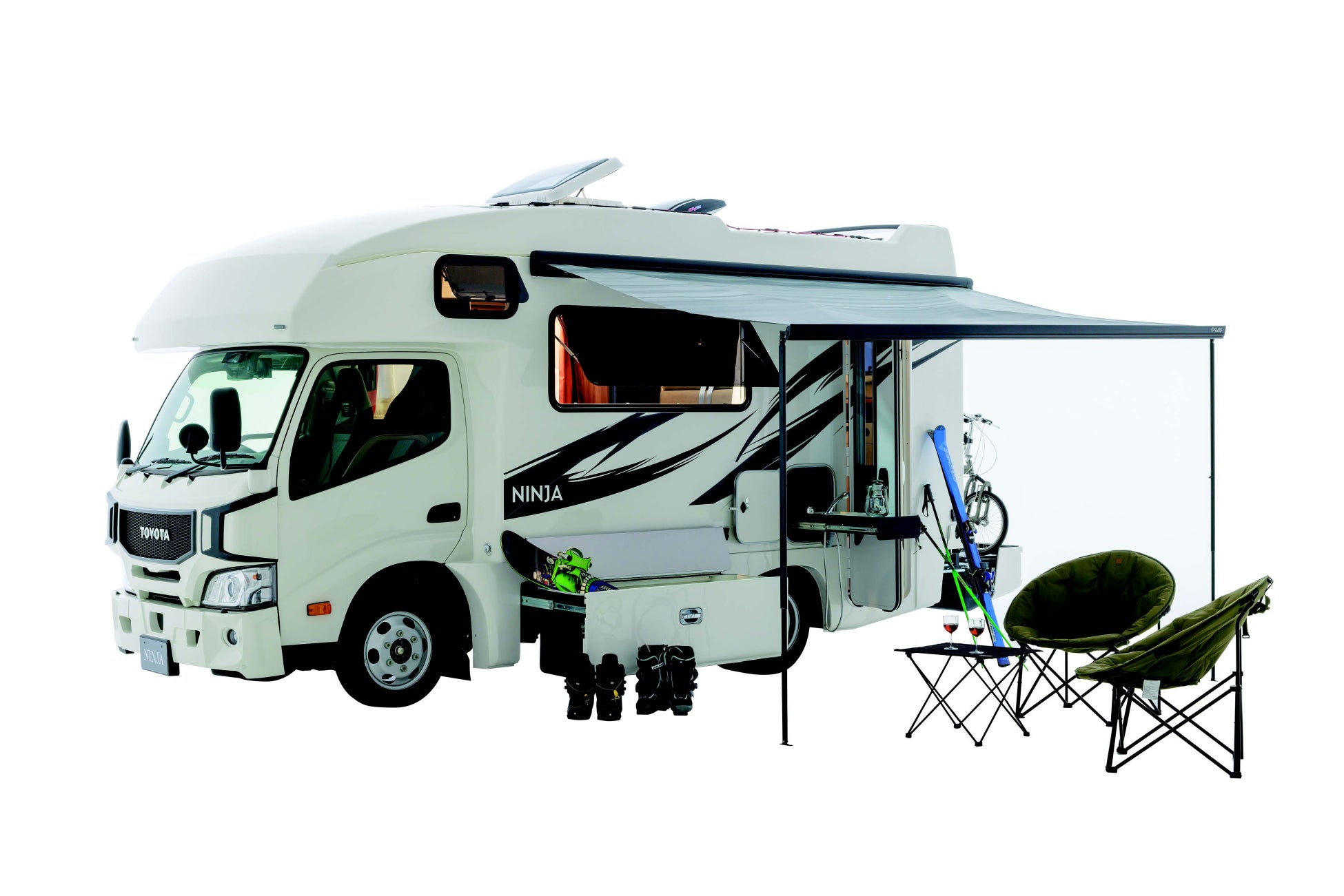 「NINJA」の名にふさわしく、まるで忍者屋敷のような隠れ収納が沢山あり、キャンピングカーには珍しい外に引き戸式の大容量収納がある利便性に長けたキャブコンです。