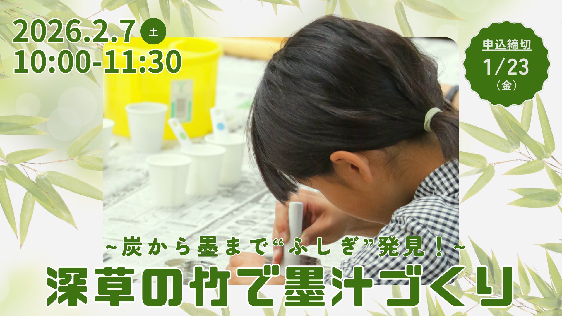 炭の持つ力について学びながら、みんなで深草の竹からつくった竹炭で墨汁づくりを体験します。できあがった墨汁で、文字や絵を自由に書いて楽しみましょう!