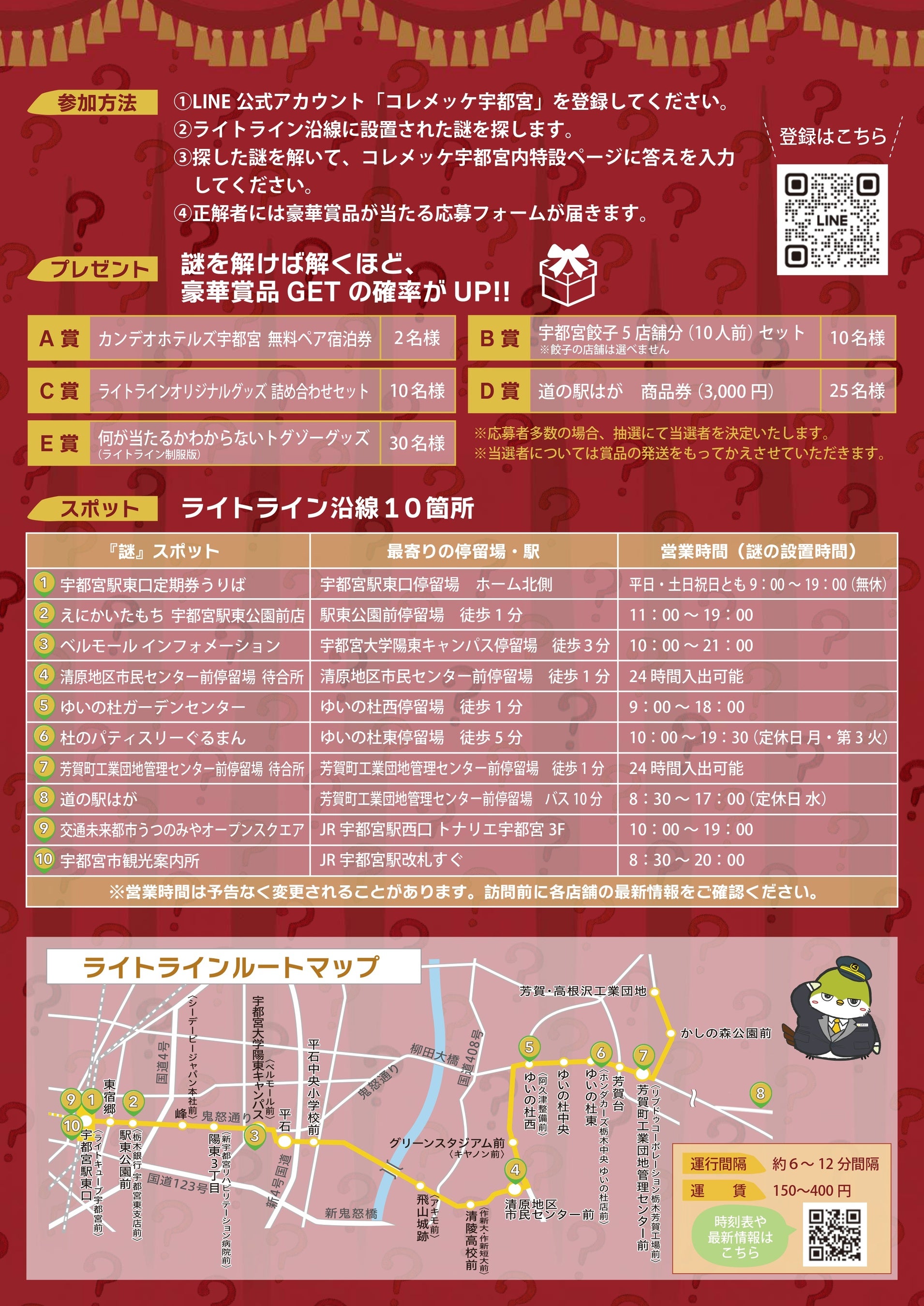 本イベントは2023年8月26日に開業したライトラインの沿線10箇所に設置した謎を探し出し、LINE公式アカウント「コレメッケ宇都宮」から回答するデジタル謎解きゲームです。