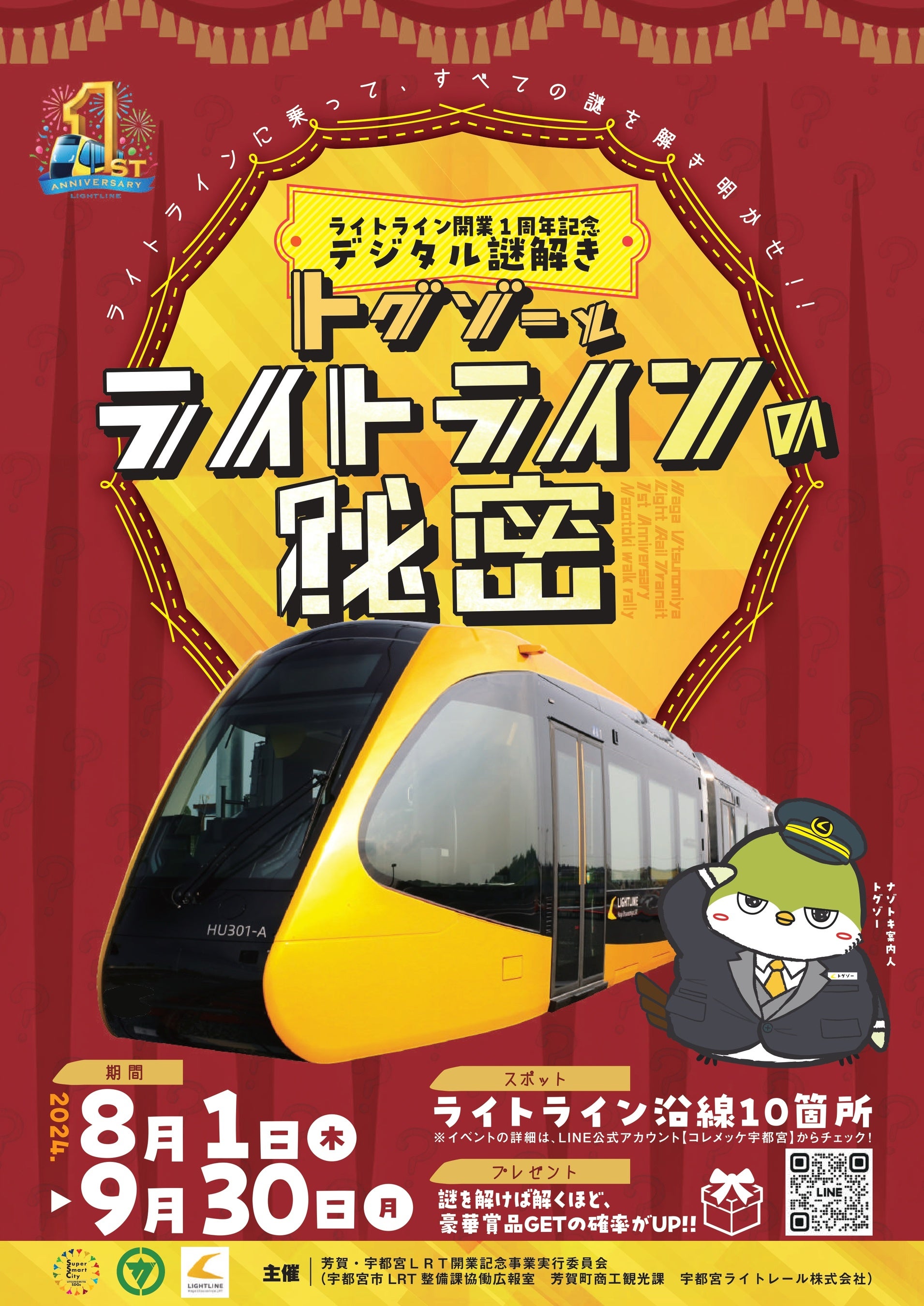 芳賀・宇都宮LRT開業記念事業実行委員会(宇都宮市・芳賀町・宇都宮ライトレール株式会社)は、8月1日(木)より、ライトライン開業1周年記念デジタル謎解き「トグゾーとライトラインの秘密」を開催します。