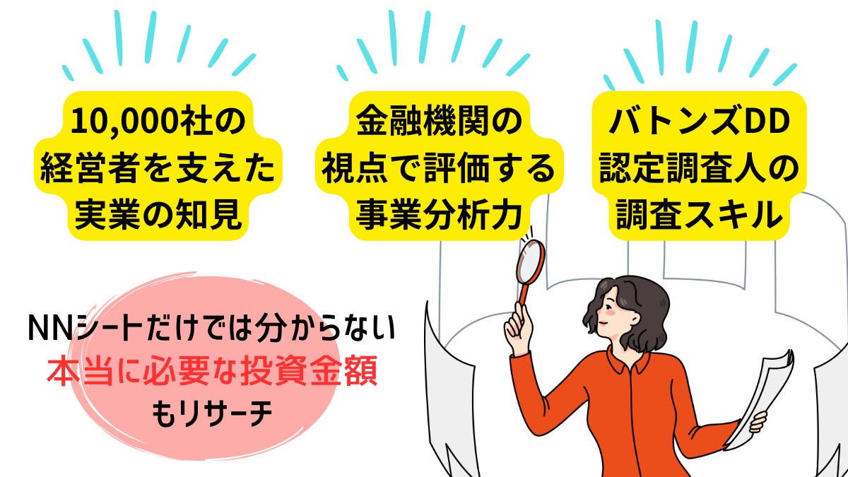 ファイナンスアイは、2014年の創業以来、資金調達やファイナンスの支援をベースに起業家や中小企業の経営者を支え、企業再生やM&Aを支援して取引先の事業価値を高め、1万社以上の経営者と現場で汗をかき続けた実績があり、金融機関の評価目線での分析能力も持っています。さらに、ファイナンスアイはバトンズDDの認定調査人であり、相手先企業の調査も担います。これらの独自のノウハウを活かして、NNシートの情報を深堀して、意思決定の判断材料になるレポートを可能にしています。