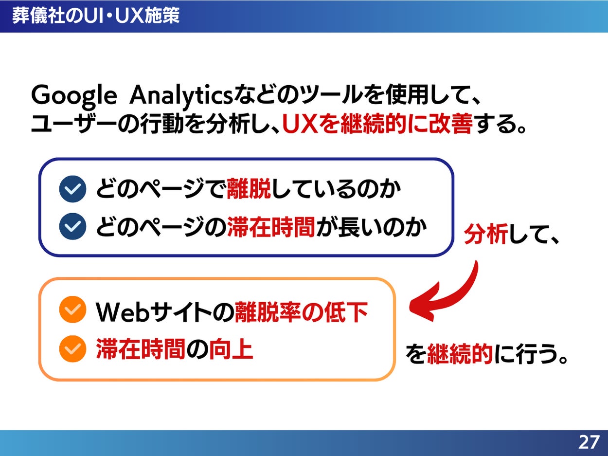 SEO(検索エンジン最適化)におけるUI(ユーザーインターフェース)とUX(ユーザーエクスペリエンス)の施策は、ウェブサイトのユーザビリティを向上させ、訪問者にとって価値のある、使いやすいサイトを提供することを目的としています。これらの施策は、直接的なランキング要因としてだけでなく、間接的にも検索エンジンの評価に影響を与えるため、SEO戦略の重要な部分です。SEO対策をする上では、UI・UXの改善手順についても理解を深めることが大切です。