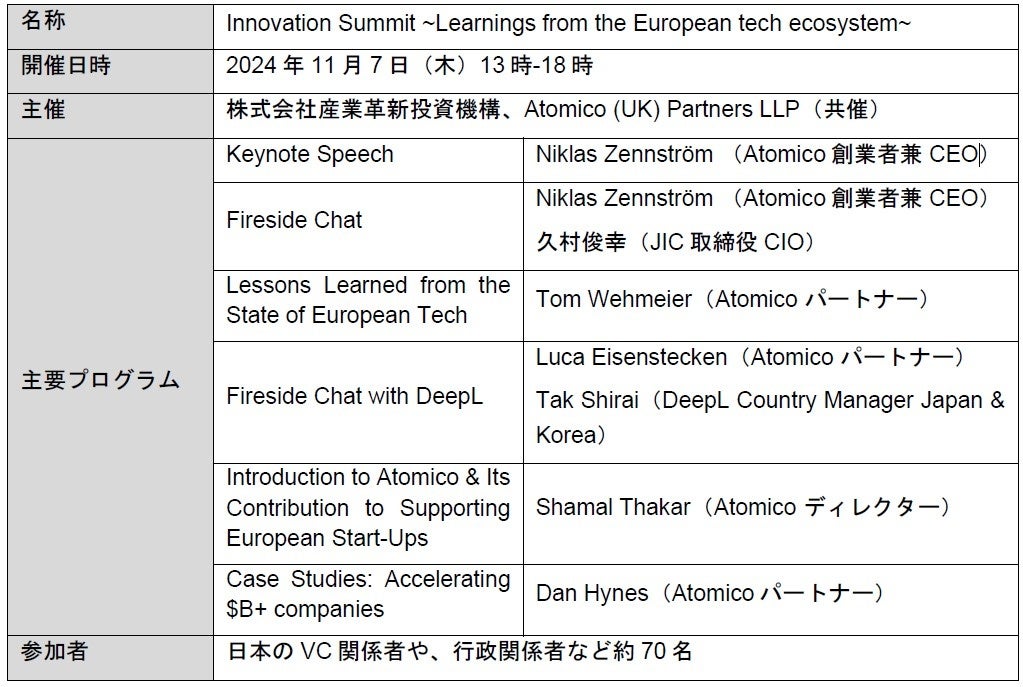 株式会社産業革新投資機構(本社:東京都港区、代表取締役社長:横尾敬介、以下「JIC」)は、2024年11月7日、欧州でテクノロジー分野を中心に投資を行うベンチャーキャピタル Atomico (UK) Partners LLP(以下「Atomico」)と共催で、日本スタートアップエコシステム発展に向けたイベント「Innovation Summit ~Learnings from the European tech ecosystem~」(以下「本イベント」)を開催いたしました。JICは2024年2月、Atomicoが運営するファンドへのLP出資を公表※しており、その関係性を基に本イベントは実現しました。