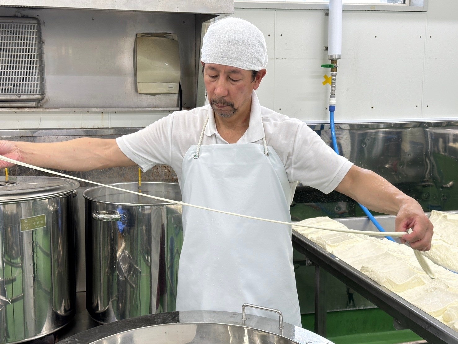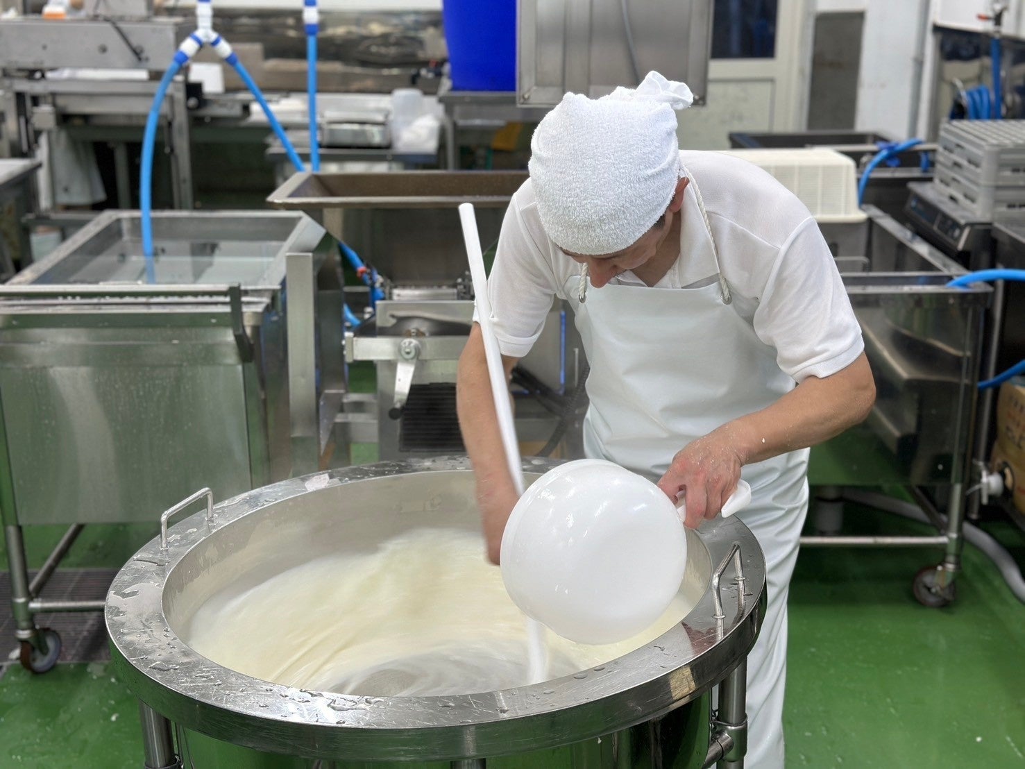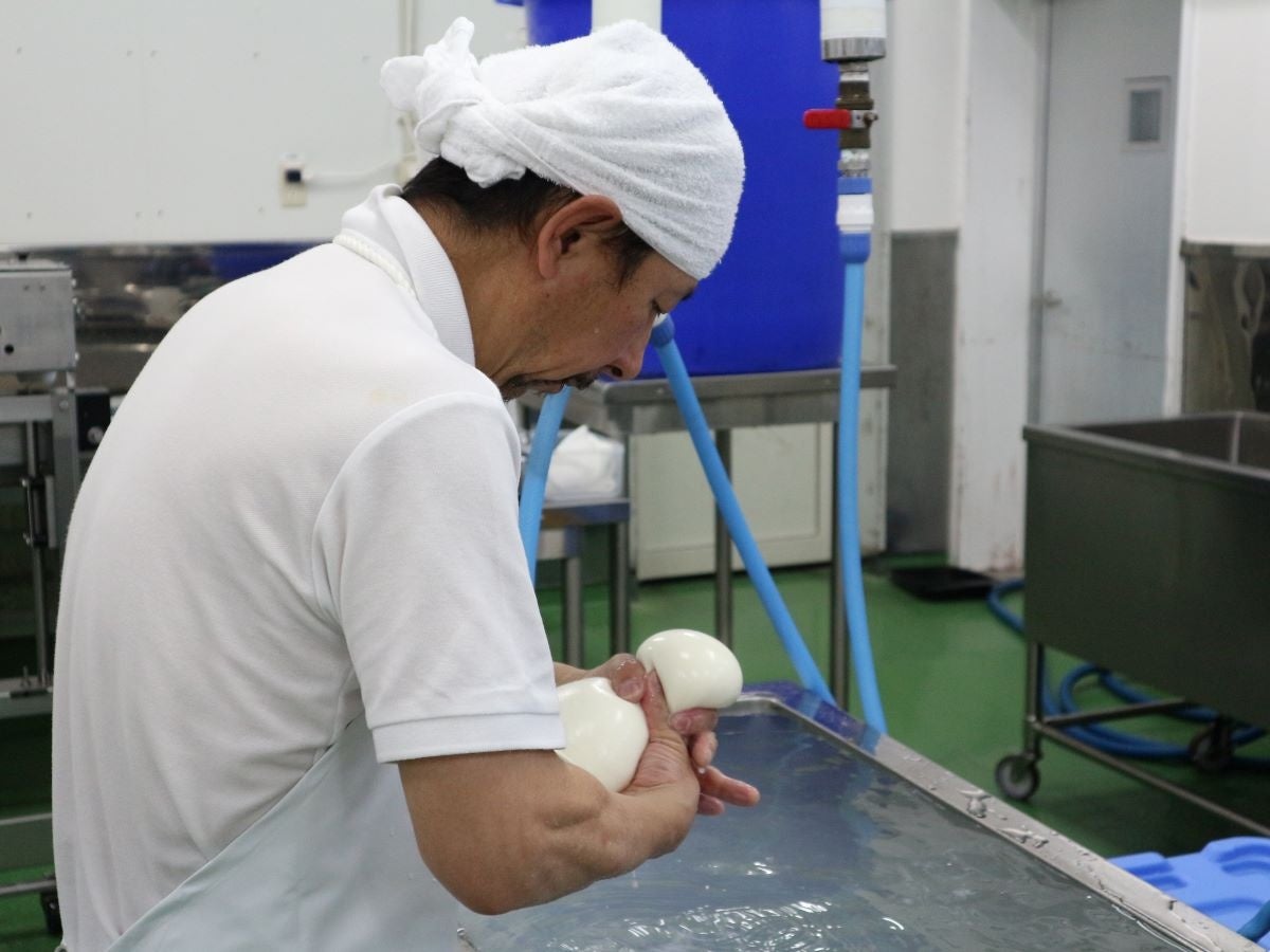及川:牧場から仕入れた生乳を殺菌し、発酵させて凝固させる。そうすると、チーズの原料となる凝乳のカードができます。その後もいくつかの工程を経て、モッツアレラチーズ作りでポイントとなる作業、フィラトゥーラに入ります。