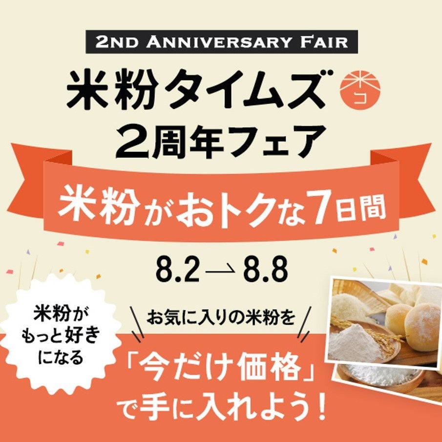 米粉タイムズ2周年を祝し、いつも応援いただいている読者、およびフォロワーの皆様に向けて、米粉(および関連商品)がおトクに手に入る「米粉タイムズ2周年フェア ~米粉がおトクな7日間~」を実施。「米コ塾」参加企業のご協力のもと、8月2日(土)~8月8日(金)の7日間限定で、米粉および関連商品を特別価格で販売いたします。