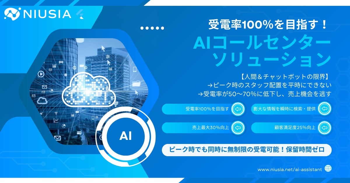 株式会社ニュウジア(本社:東京都中央区、代表取締役:柏口之宏、以下、ニュウジア)は、瞬間的に増加する受電対応の課題を根本から解決する「AIコールセンターソリューション」を発表いたしました。本ソリューションは、受電率の低下を防ぎ、売上機会を最大化するとともに、顧客満足度の向上を実現する革新的な製品です。