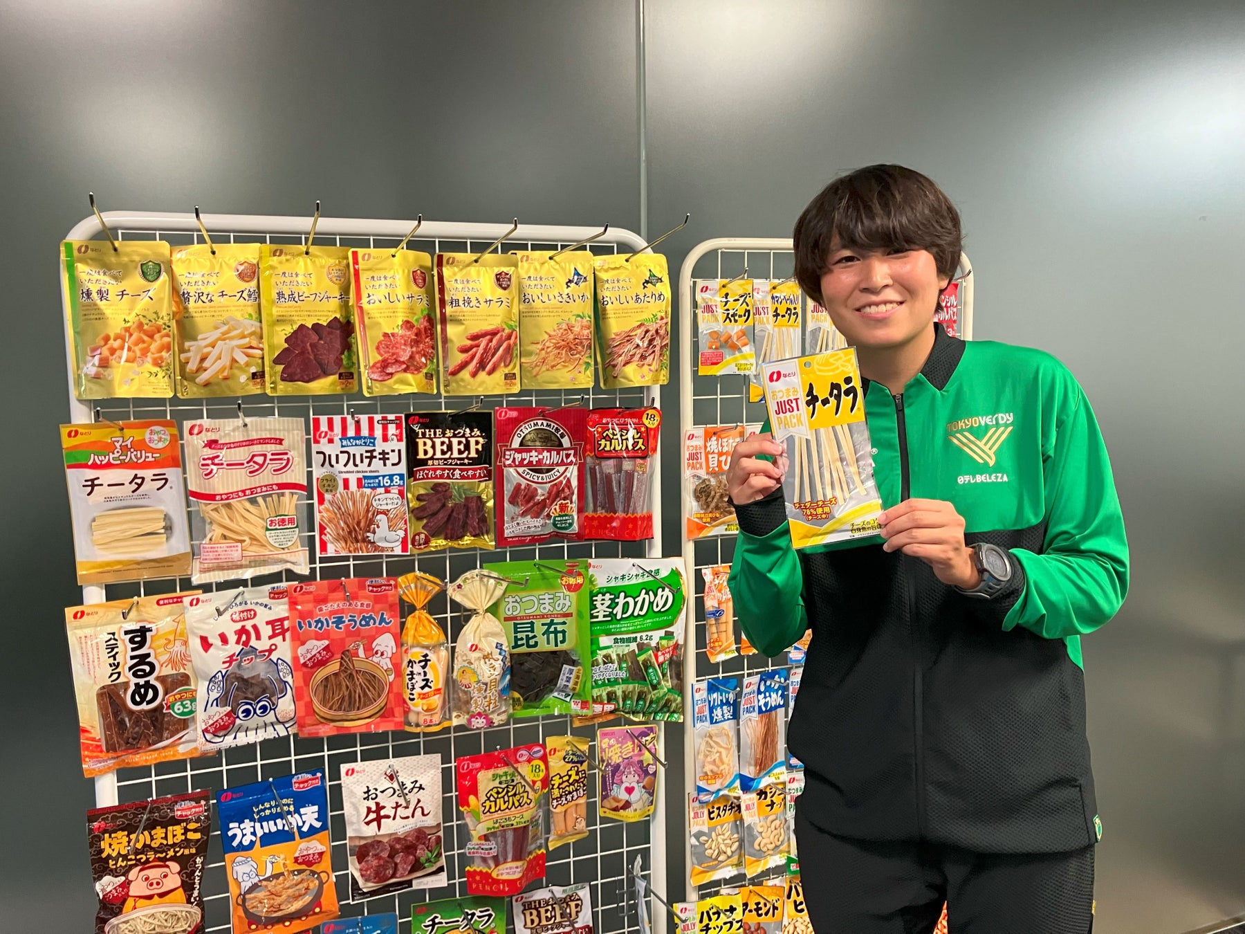 10月17日(木)、木下桃香選手が当社に来社されました。実際に当社商品3品(「JUSTPACK 黄金さきいか」「JUSTPACK お得なカルパス」「JUSTPACK チータラ」を試食していただいた中から、今回の企画に合うビールにぴったりで、濃厚でおいしいという理由で「JUSTPACK チータラ」を選定されました。
