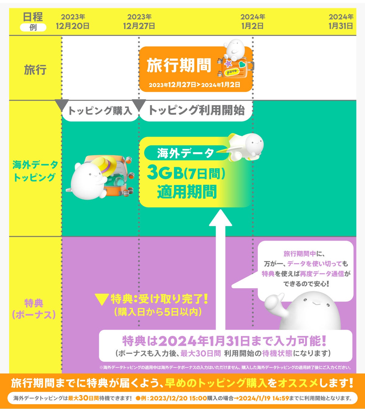 例えば12月22日に海外データトッピングを購入した場合、12月27日までに特典の海外データをお届けします。購入したデータは海外現地到着と同時に利用が開始され、特典のデータは、購入したデータの利用終了後に引き換えコードを入力することで、利用することができます。