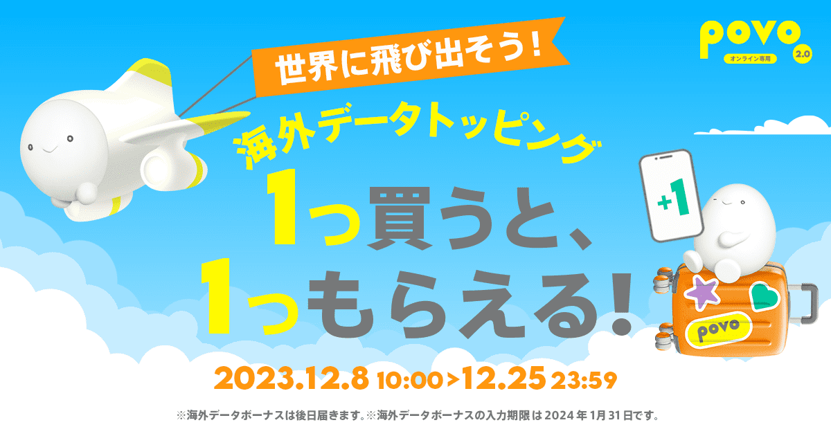 KDDI、沖縄セルラーは2023年12月8日から12月25日まで、povo2.0において、海外データトッピングを1つ買うと、同じ内容をもう1つもらえるキャンペーンを実施します。