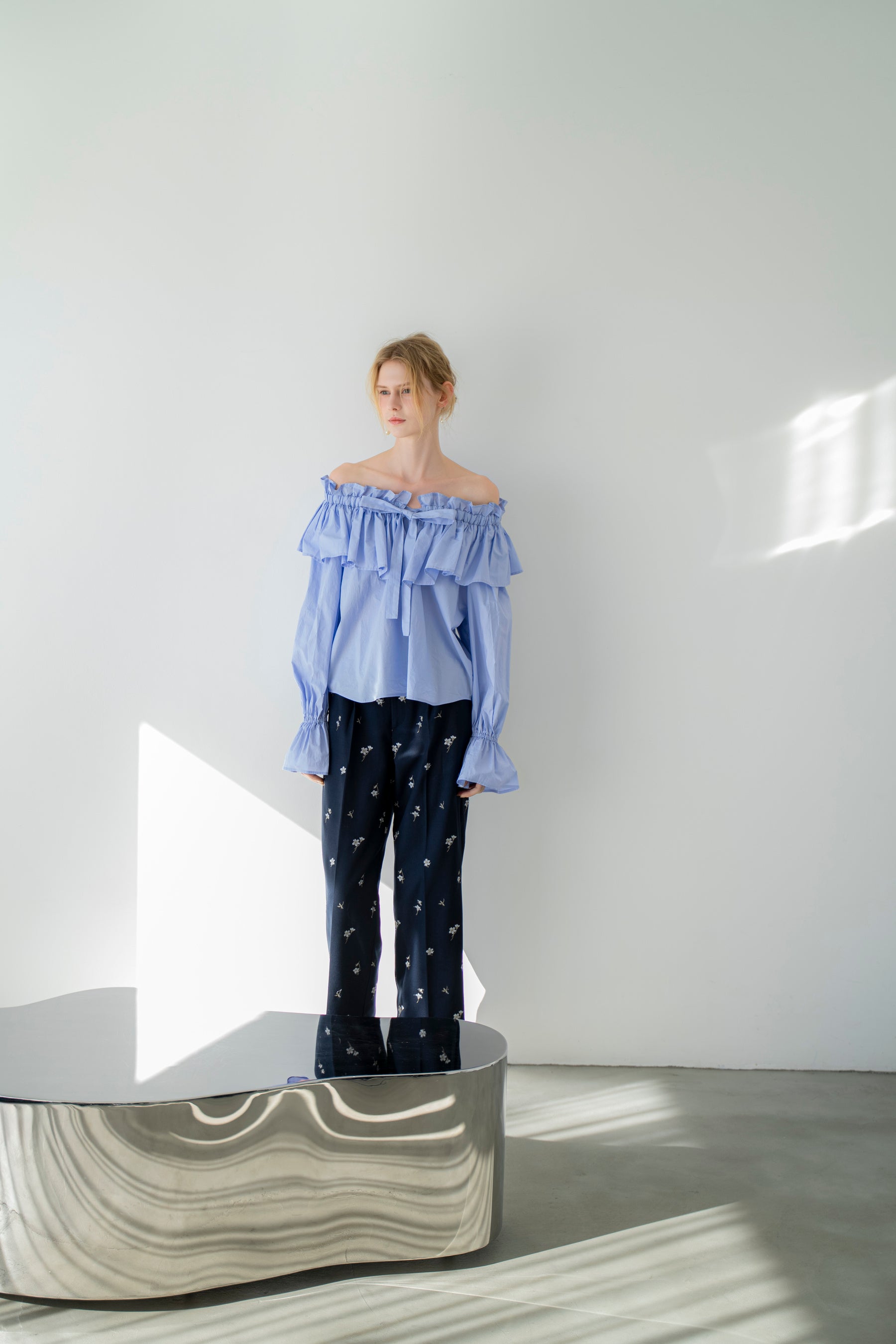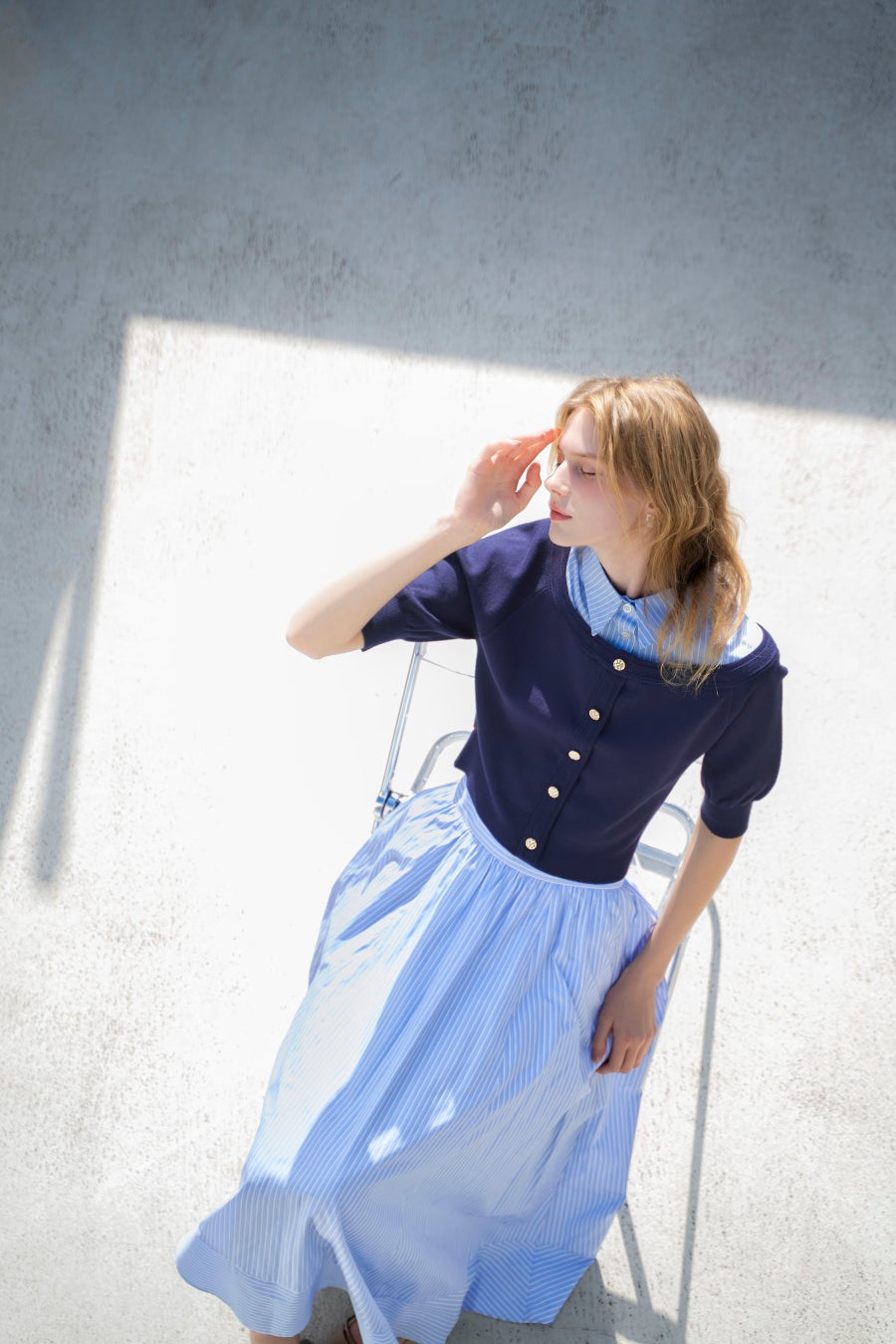 柔らかなペールピンクや、タイムレスなシャツブルーを重ねて。