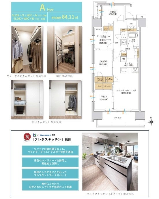 3LDK 71.38㎡~4LDK 84.11㎡の全6タイプのプランをご用意しました。キッチンは長谷工コーポレーションとタカラスタンダードが開発した新発想の「フレタスキッチン」を宇都宮市で初めて採用。薄型のレンジフードやキッチン前面の壁をなくし、リビング・ダイニングとの一体感を実現しました。モデルルームのAタイプにはウォークインクロゼットのほか、納戸や布団クロゼットを採用し収納量に拘りました。