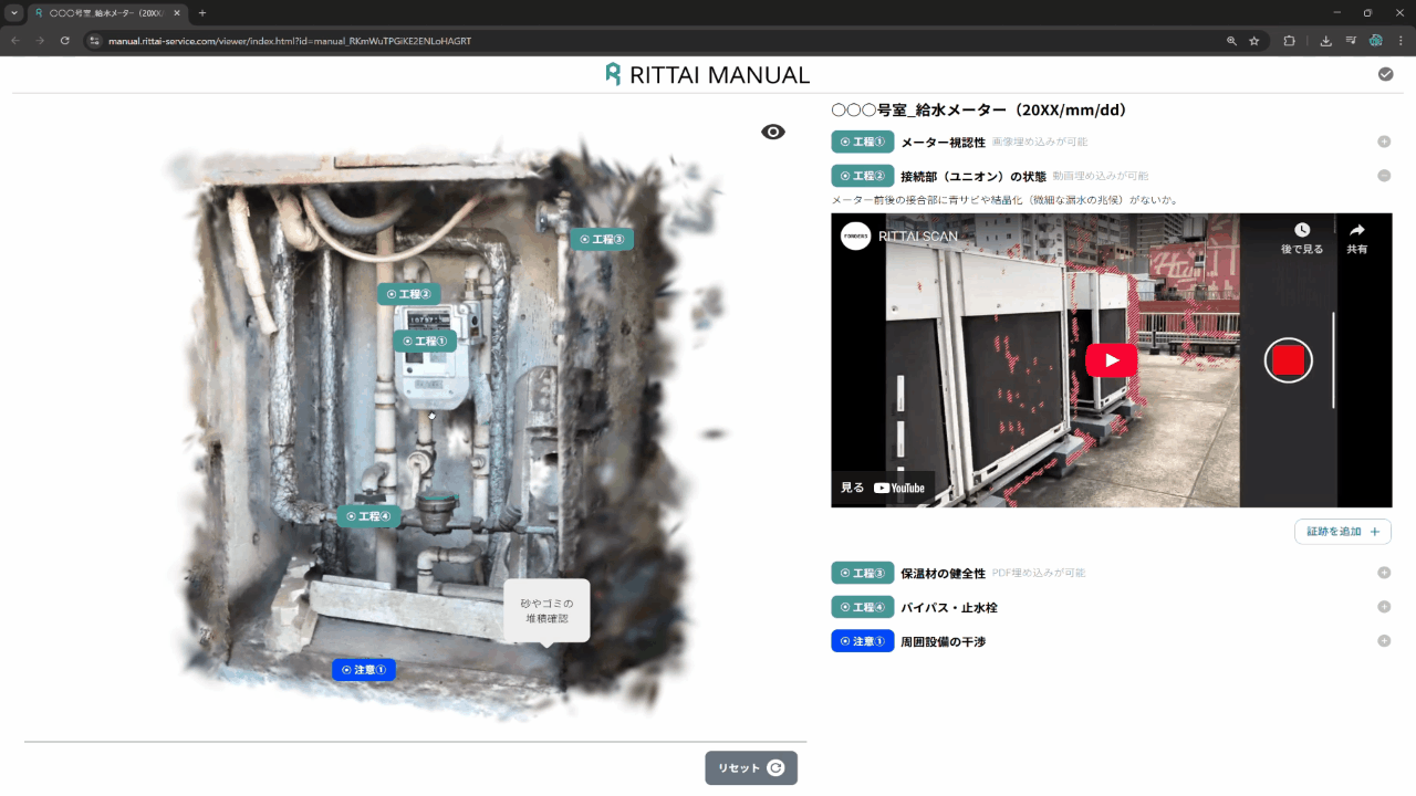 3Dスキャンが難しい金属設備や配管でも、3D GSとしてRITTAI MANUALへ取り込み、Web上で手順・注意点を3Dで共有できるようになりました。教育のばらつきや作業ミスの低減に貢献します。