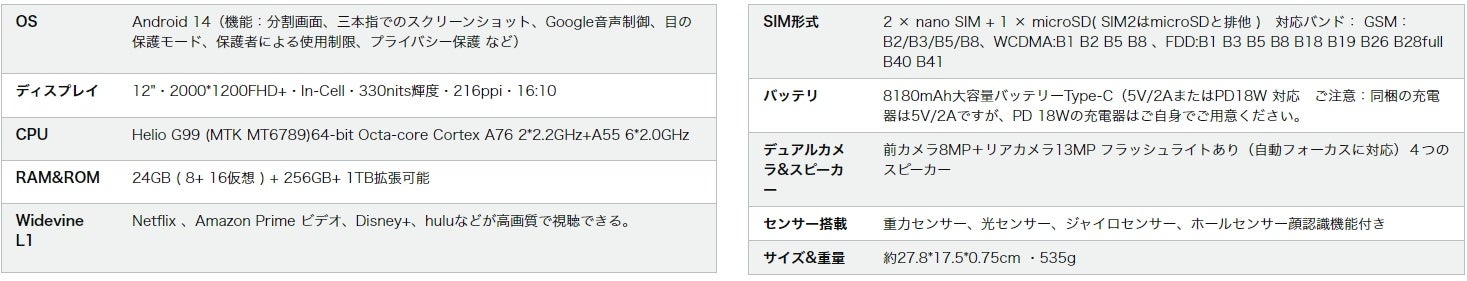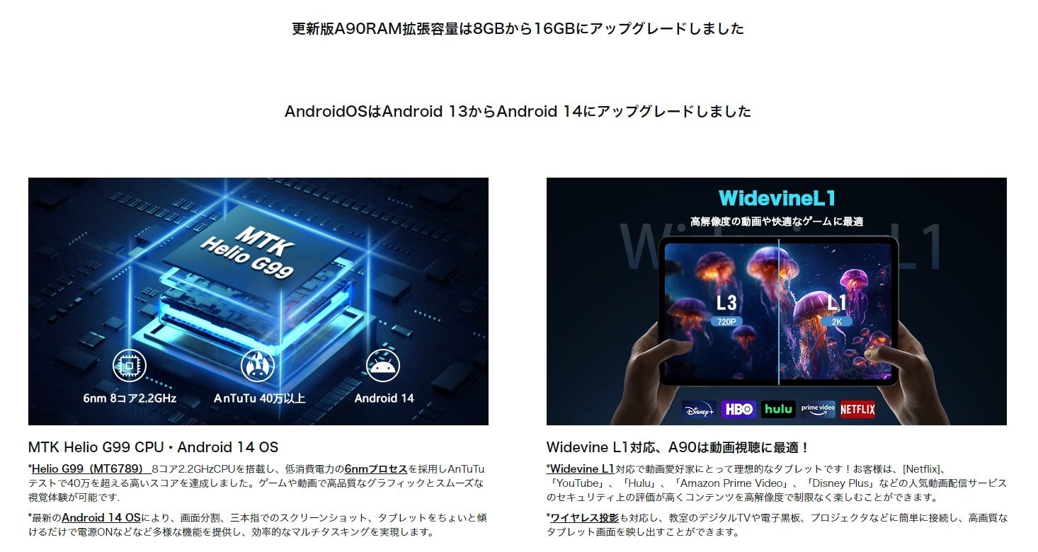 [𝗠𝗧𝗞 𝗛𝗲𝗹𝗶𝗼 𝗚𝟵𝟵 ・𝗪𝗶𝗱𝗲𝘃𝗶𝗻𝗲 𝗟𝟭]アップグレードされたAvidPad A90タブレットは、強力な6nm Helio G99 CPUと2つの2.2GHzのCortex-A76コアと6つの2GHzのCortex-A55コアを搭載し、これにより、快適なゲームプレイ、スムーズなマルチタスク、複雑なタスクの迅速な処理が可能です。Helio G99搭載により、人気のあるゲームである原神も快適にプレイできます!またAvidPad A90アンドロイド14タブレット12インチはWidevine L1 DRM保護に対応しているため、NetflixやAmazon Prime Video、Disney+、Huluなどのサービスで高画質コンテンツを楽しむことができます.