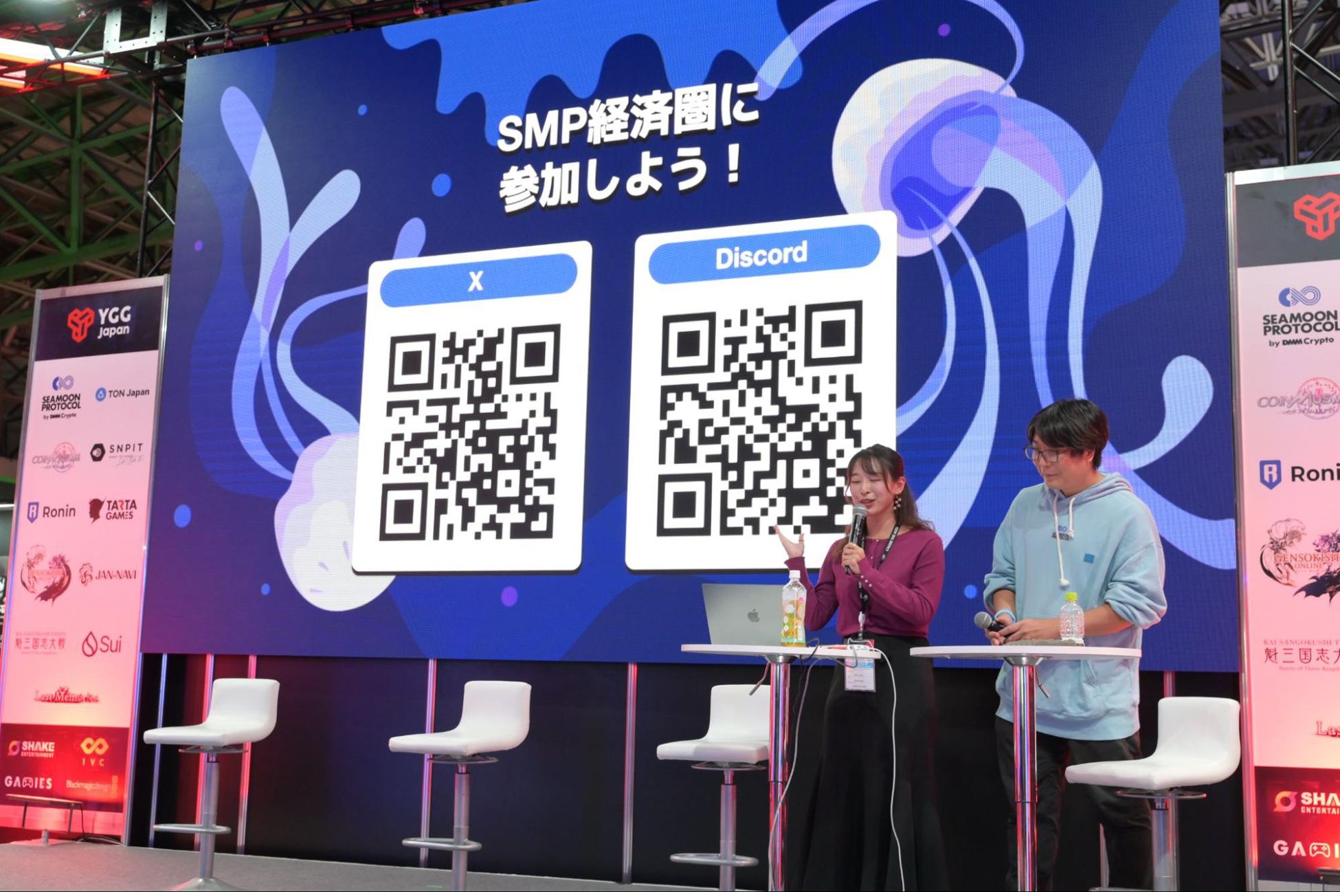 DMMグループのDMM Cryptoが運営する「遊び時間が投資になる」Web3プロジェクトSeamoon Protocolによる本ステージは、二日間に渡る二部で構成されました。Seamoon Protocolで展開されるゲームタイトル,『かんぱに☆ガールズ RE:BLOOM』『神櫓-KAMIYAGURA-』『江戸前モンスターズ』、『Bounty Hunters』『コインムスメ』『Kyrie & Terra』『Crypto Miner 2』『Cross The Ages』が登場し、ステージを盛り立てました。