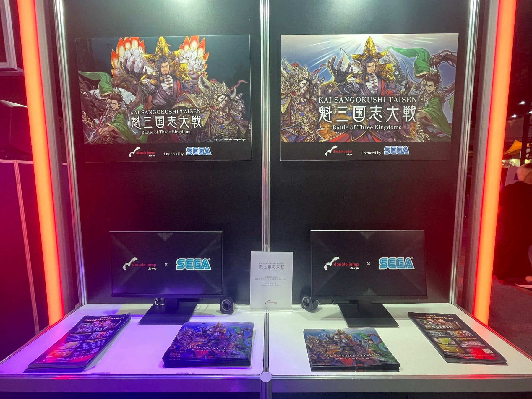 『魁 三国志大戦』ブースでは、ゲームの紹介動画をメインにチラシを配布。また、ステージであった発表に対してさまざまな質問に関して答えておりました。