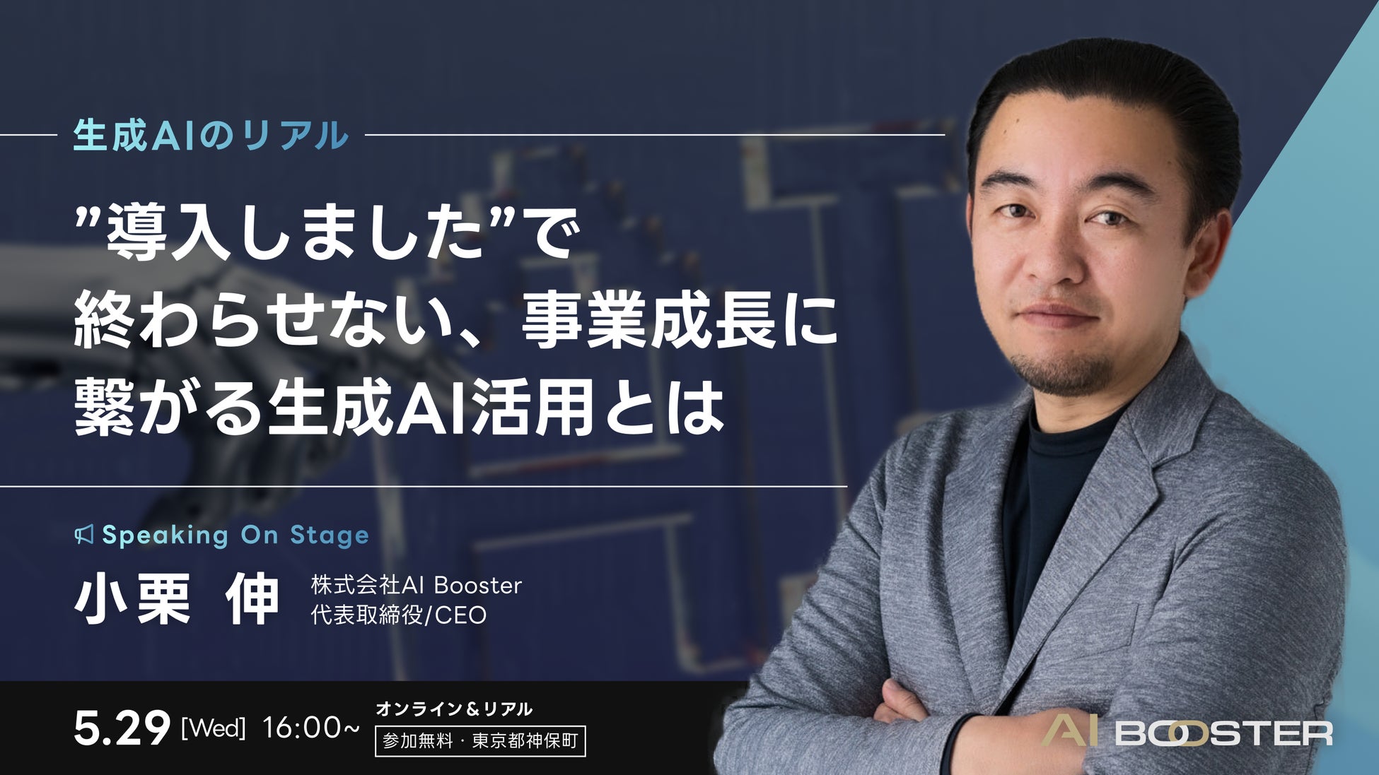 業界初のAIタレント「AI am MAAYA」など、生成AIを活用したエンタメ向けサービスを提供する株式会社AI Booster(本社:東京都港区、代表取締役社長:小栗伸)の小栗伸が、2024年5月29日にハイブリッド開催される株式会社ロゼッタ(本社:東京都千代田区、代表取締役社長:渡邊 麻呂)主催イベント「生成AIのリアル ~“導入しました”で終わらせない、事業成長につながる生成AI活用とは~」に登壇いたします。