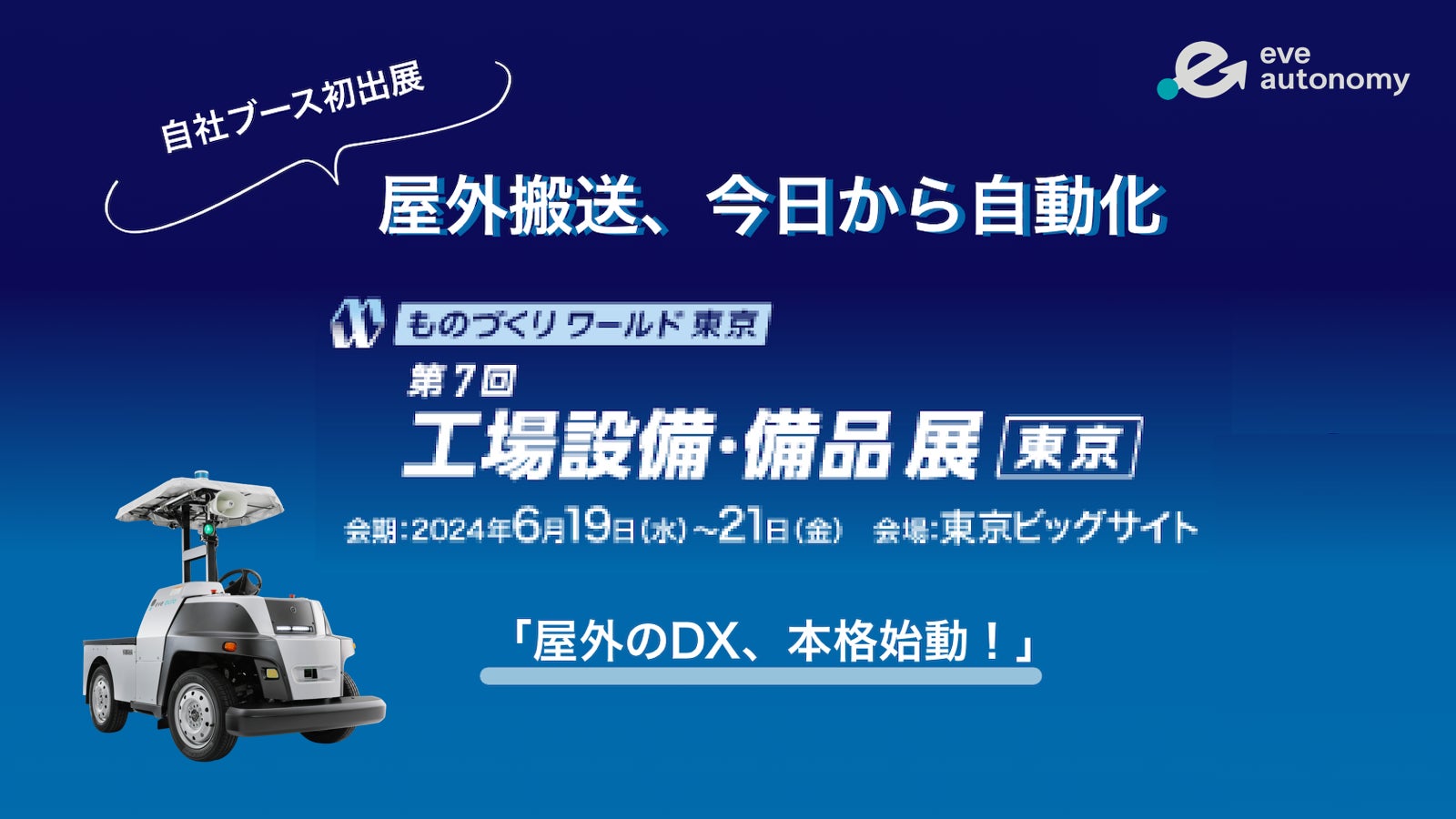 株式会社eve autonomy(イブ・オートノミー、静岡県磐田市、代表取締役:星野 亮介、以下「eve autonomy」)は、東京ビッグサイトにて2024年6月19日~21日に開催される『ものづくりワールド東京 工場設備・備品展』にeve autonomyとしてのブースを初出展し、自動運転EVを活用した屋外対応の無人搬送サービス『eve auto®(イヴ オート)』の実機を展示し、併せて出展社セミナーも開始し、eve autoサービスの詳細や導入事例について詳しく紹介します。