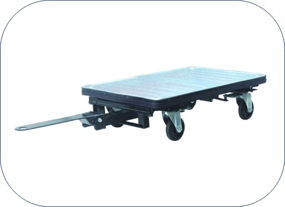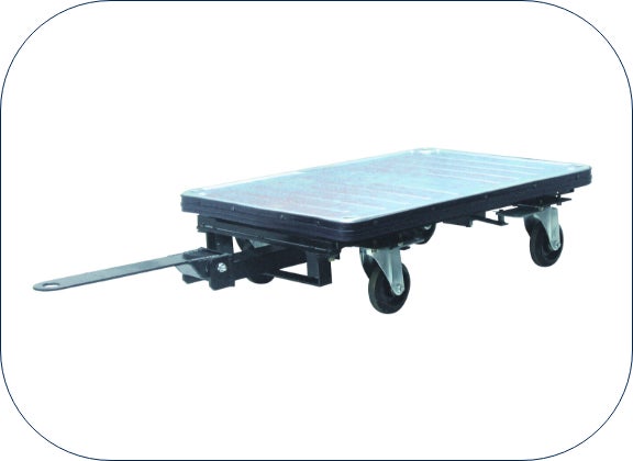 空港用ドーリーのシャア90%を誇る花岡車輛の製造する4WS台車です。耐荷重300kgで5連結でも内輪差が発生せず屋外だけでなく、屋内の狭いエリアでも牽引が可能です。お客様のご要望に応じて耐荷重の調整、荷台寸法の調整が可能です。