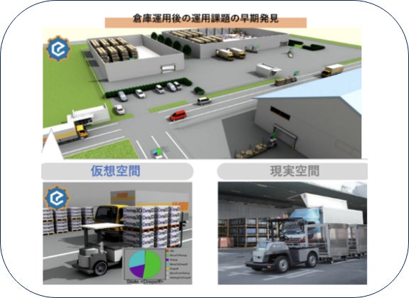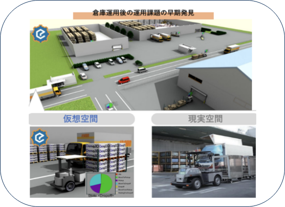 本展示会では、倉庫の建屋間搬送についてeve auto導入前後の効率化イメージを仮想空間で再現したものを展示いたします。