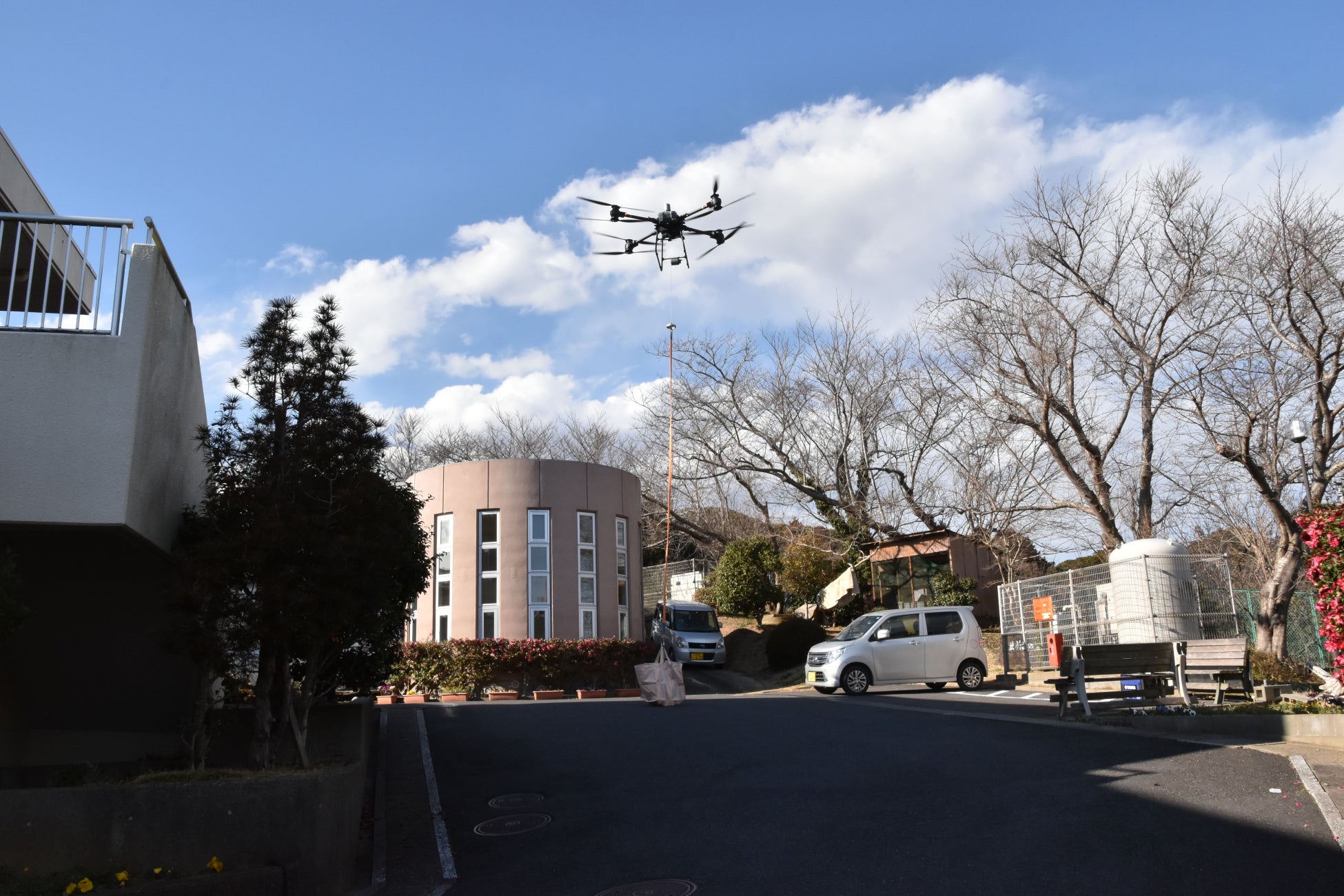 日用品のドローン配送モデルを構築:高齢者や移動が困難な住民の支援を目的とし、トイレットペーパーや飲料水、食品などの生活必需品をドローンで個人宅まで配送しました。