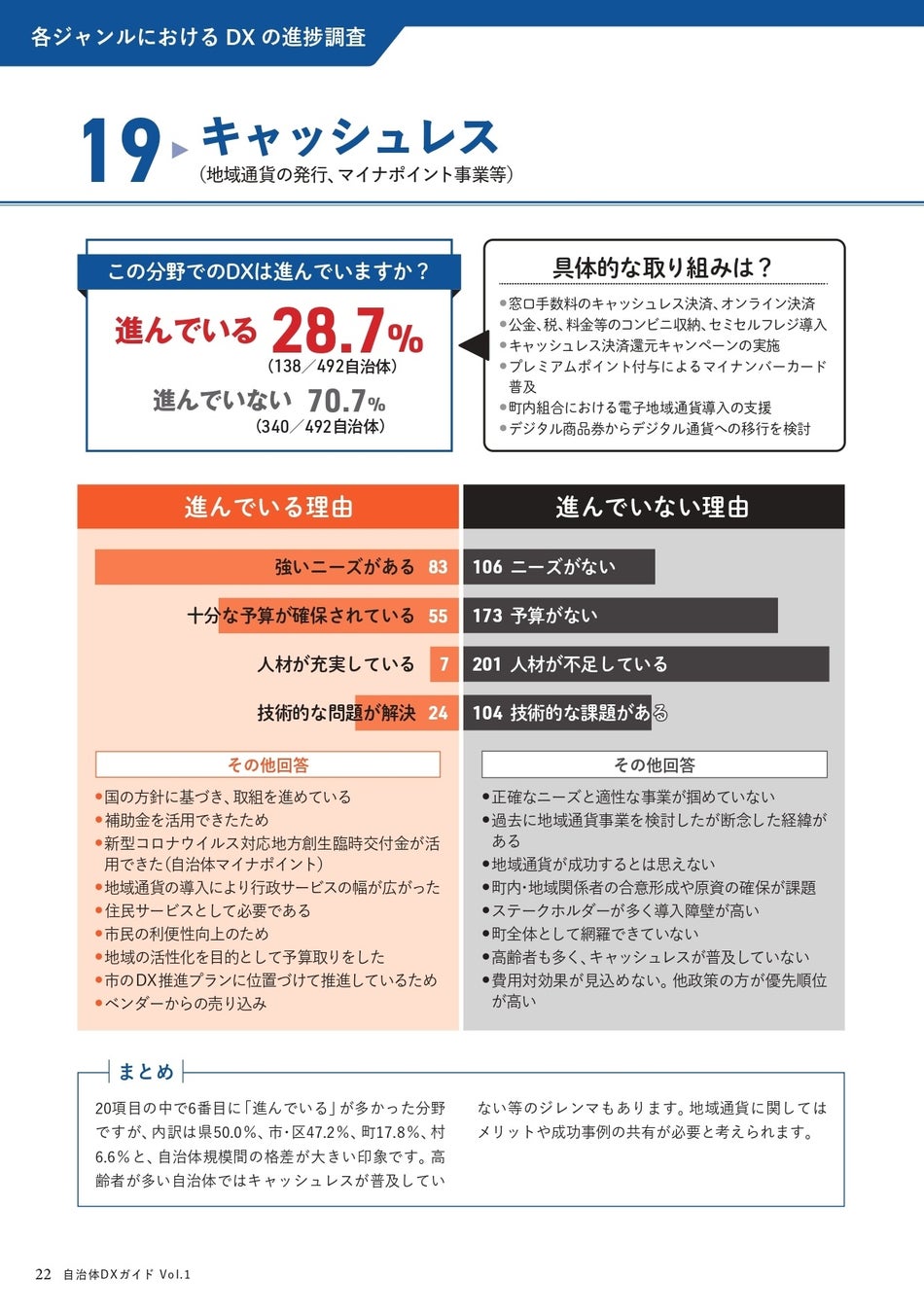 DX推進の理由としては、強いニーズの存在、十分な予算の確保、新型コロナウイルス対応地方創生臨時交付金の活用、地域通貨の導入による行政サービスの拡大などが挙げられます。しかし、進んでいない自治体は70.7%に上り、ニーズの不明確さ、予算不足、人材不足、技術的な課題、高齢者の多い自治体でのキャッシュレス普及の難しさなどが挑戦となっています。
