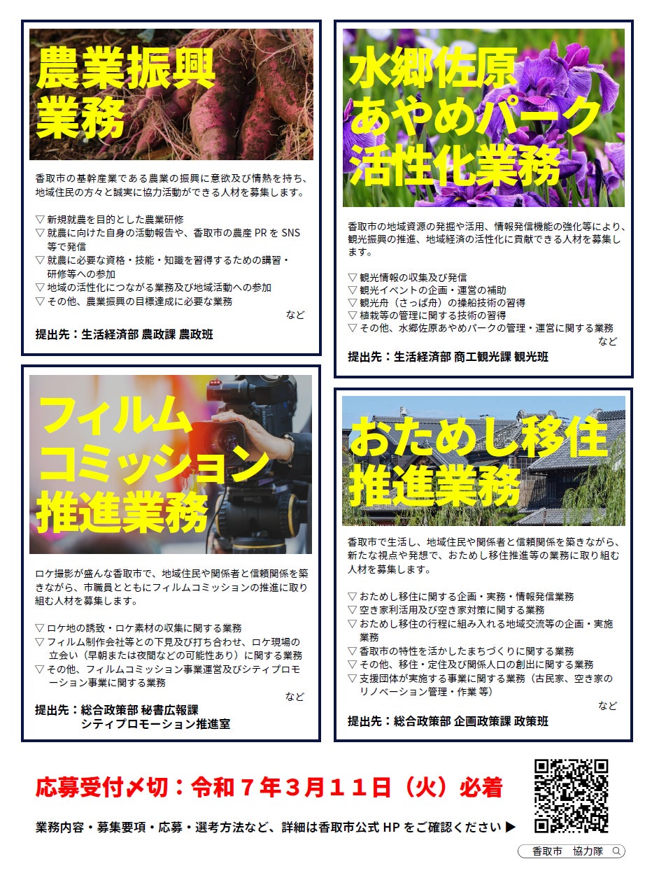 このたび、香取市で生活し、地域住民や関係者と信頼関係を築きながら、新たな視点や発想で、地域課題に取り組む、香取市地域おこし協力隊の隊員を新規に募集します。