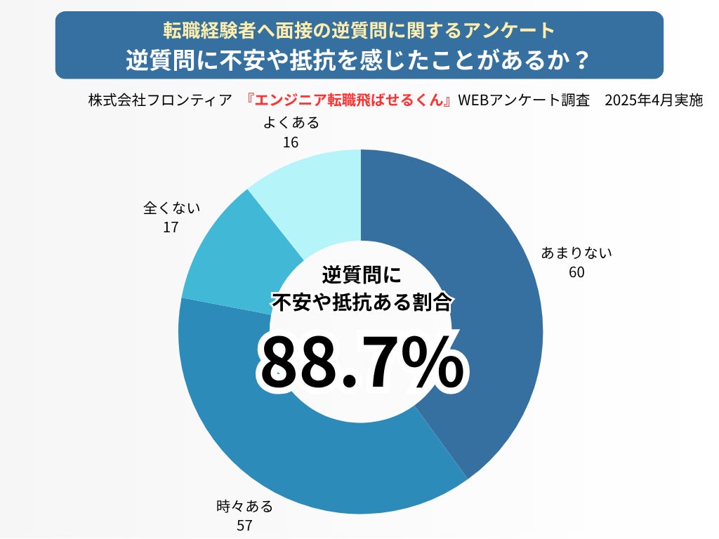 今回、株式会社フロンティアはエンジニア転職 面接飛ばせる君の無料相談窓口の開設に伴い、「逆質問」に関する調査レポートを公開。面接で「逆質問が苦手」と感じたことがある転職経験者150名を対象にアンケートを実施。
