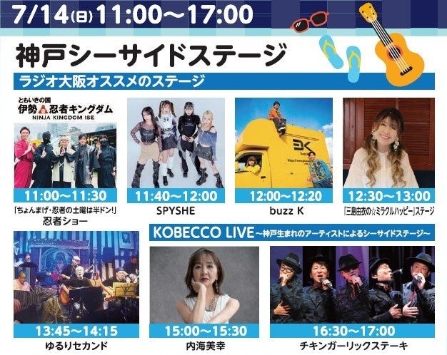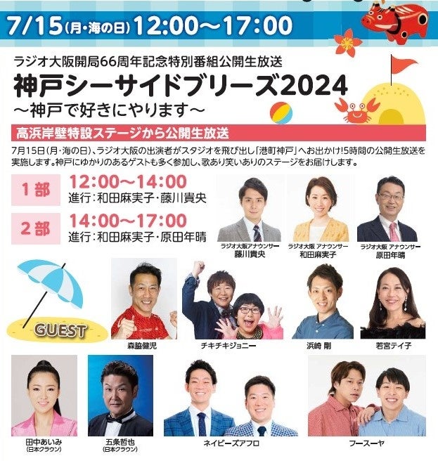 14日(日)はライブステージ、15日(月・海の日)は公開生放送を、ラジオ大阪おなじみの出演者の他、神戸にゆかりのあるアーティストなど、豪華出演者が勢揃いし、夏の日差しに負けない歌あり笑いありの熱いステージで神戸ハーバーランドに心地よい賑わいの波を起こします。