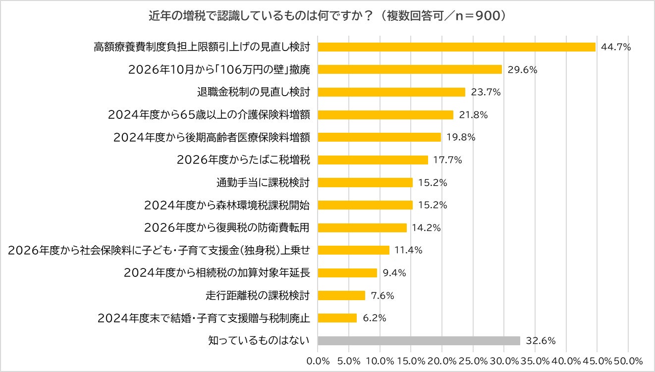 増税に関する認知度調査「高額療養費制度の負担上限引上げ検討」が最多、次いで「106万円の壁撤廃」 一方、「何も知らない」3割超も