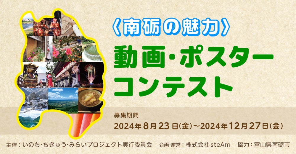 自然豊かな南砺市(富山県南西部)は、日本の伝統文化が今も色濃く残る地域です。民芸運動の創始者である柳宗悦や世界的板画家の棟方志功などのゆかりの地でもあります。この度、ここ南砺市から「伝統文化」や「郷土芸能」の意義を紐解き、さまざまな団体や地域との連携によって未来を明るく照らしていこうという「いのち・ちきゅう・みらいプロジェクト」が中心となり「<南砺の魅力>動画・ポスターコンテスト」が開催されます。同プロジェクトは企業版ふるさと納税によって活動しており、株式会社steAm(本社:東京都豊島区、代表:中島さち子)は「いのち・ちきゅう・みらいプロジェクト実行委員会」からの委託によって本コンテストの企画運営を担当します。