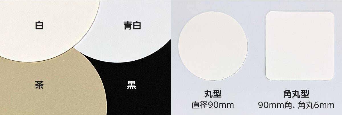 コースター(活版印刷)では、従来の白色の用紙に「青白、茶、黒」を加えた4種の用紙をご利用可能です。また、形状は丸型と角丸型の2種がございます。