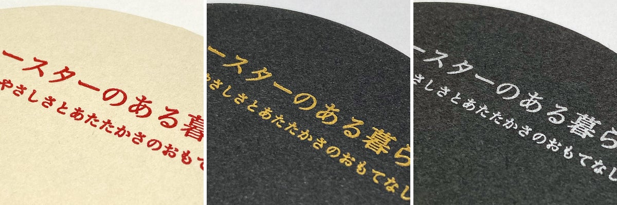 「黒」の用紙では、金、銀の限定色を使った印刷が可能です。リーズナブルな価格ながらも、高級感のあるコースターを作成したい場合に最適です。