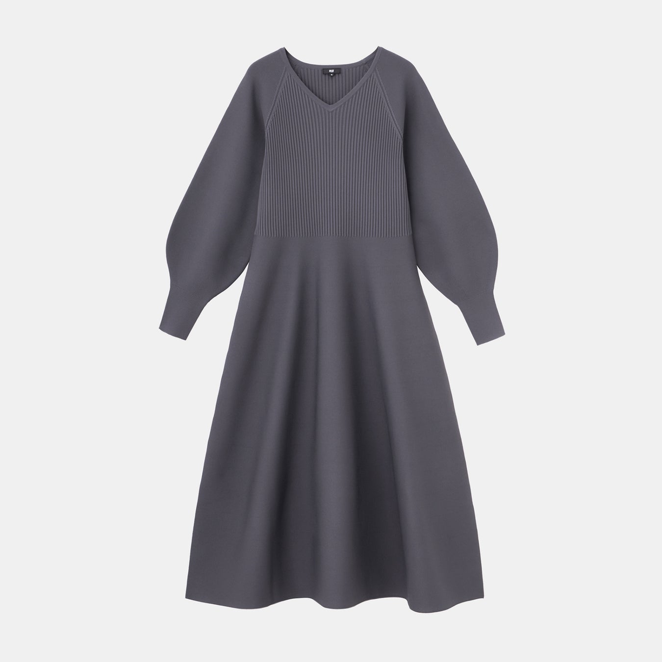 「ホールガーメント®Vネックフレアワンピース」は、タイトフィットな身頃とボリューム感のある袖とスカートのコントラストが立体的なフォルムをつくり、一枚でも華やかな着こなしが完成します。