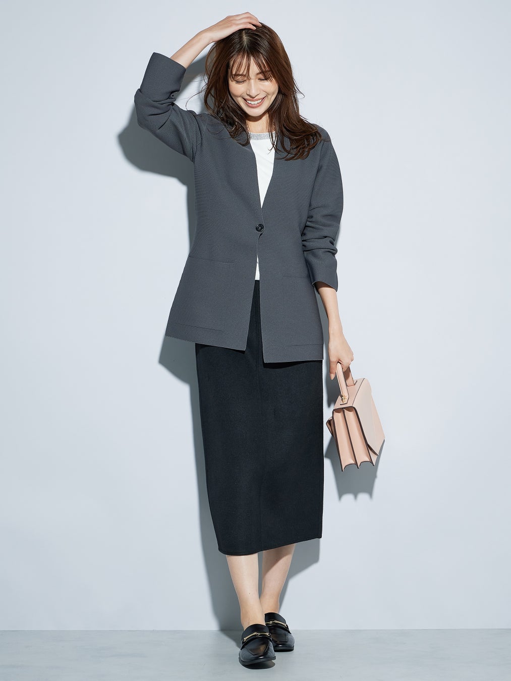 ○ニットならではの伸縮性で着心地抜群のカラーレスジャケット