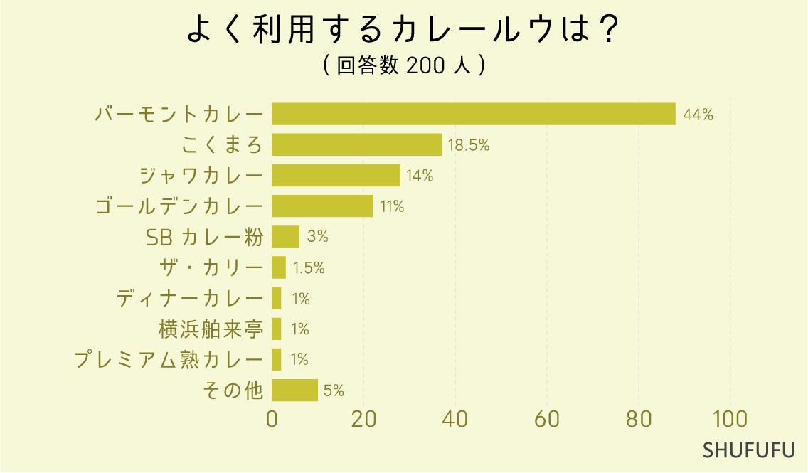 よく利用するカレールウは?の問いに対して最も多かったのが「バーモントカレー(44%)」でした。 次いで「こくまろ(18.5%)」「ジャワカレー(14%)」という結果でした。 1位の「バーモントカレー」が2位の「こくまろ」の倍以上の利用数でした。