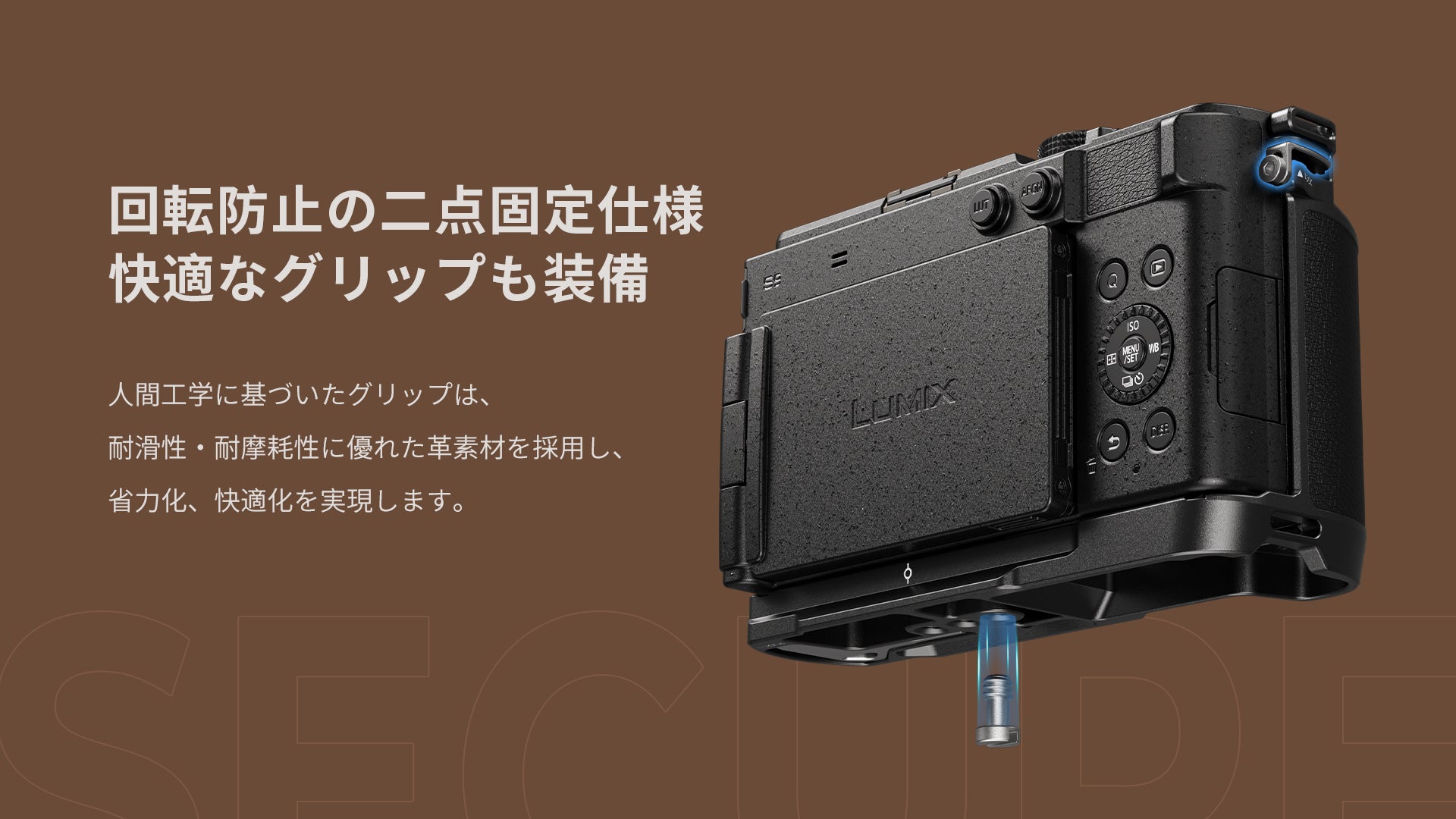 人間工学に基づいたLUMIX S9用L型グリップはカメラ本体にぴったりし、小型軽量の本体デザインを損なうことなく、一体感のあるフォルムと質感を実現します。