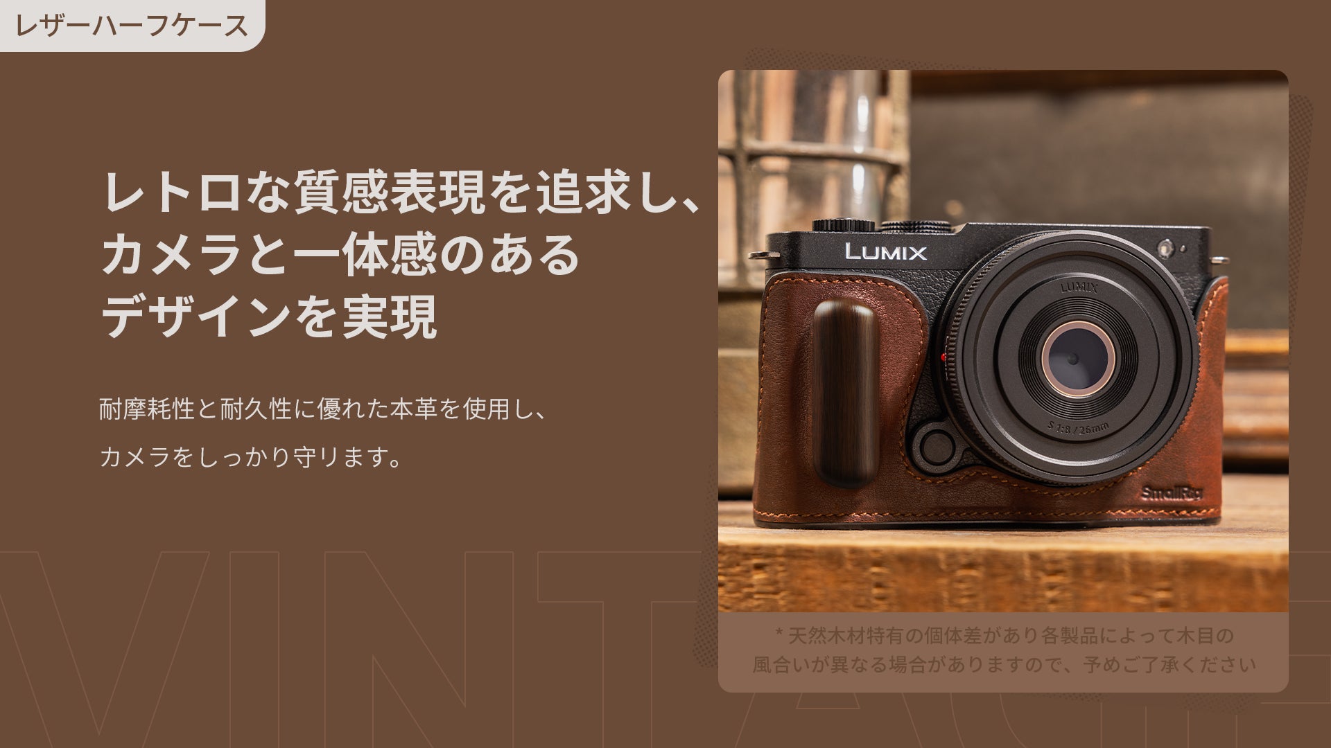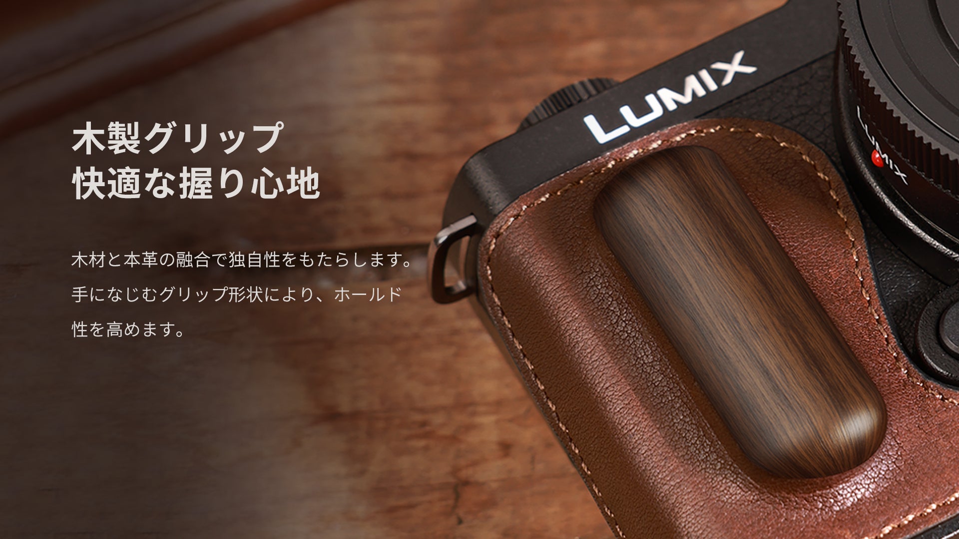 LUMIX S9用レザーハーフケースは耐摩耗性と耐久性に優れた本革を使用し、木材との融合で独自性をもたらします。レトロな質感表現を追求し、カメラと一体感のあるデザインを実現します。
